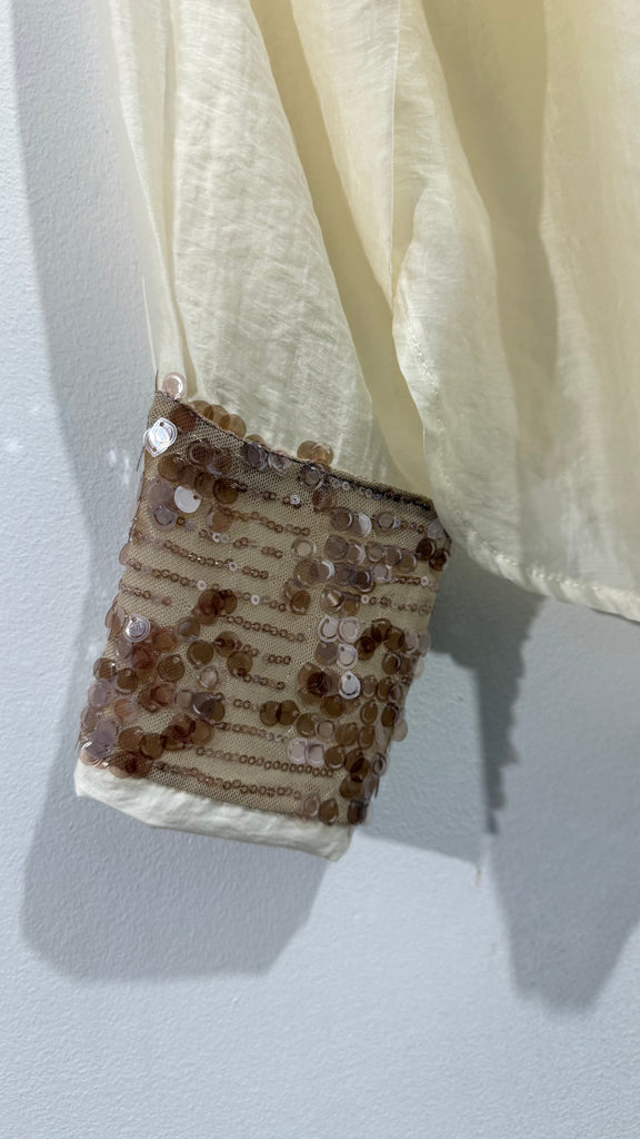 Blusa de lyocell en color crudo, tejido fluido tipo organza finita y detalle de bolsillo a un lateral de lentejuelas en color champagne. Maxi puños de lentejuelas. Escote a pico.