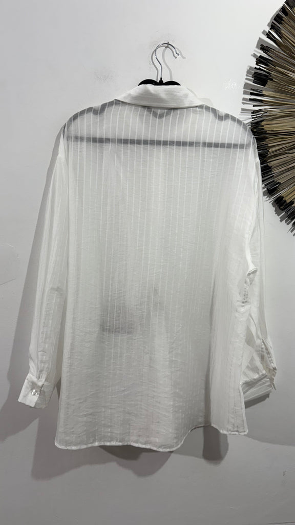 Camisa Blanca, con raya diplomática en tono más clarito. Es de corte recto, manga larga, botones en parte delantera, cuello con solapa y cruzada. Tiene hebillas de poli piel en color marrón, un lateral.
