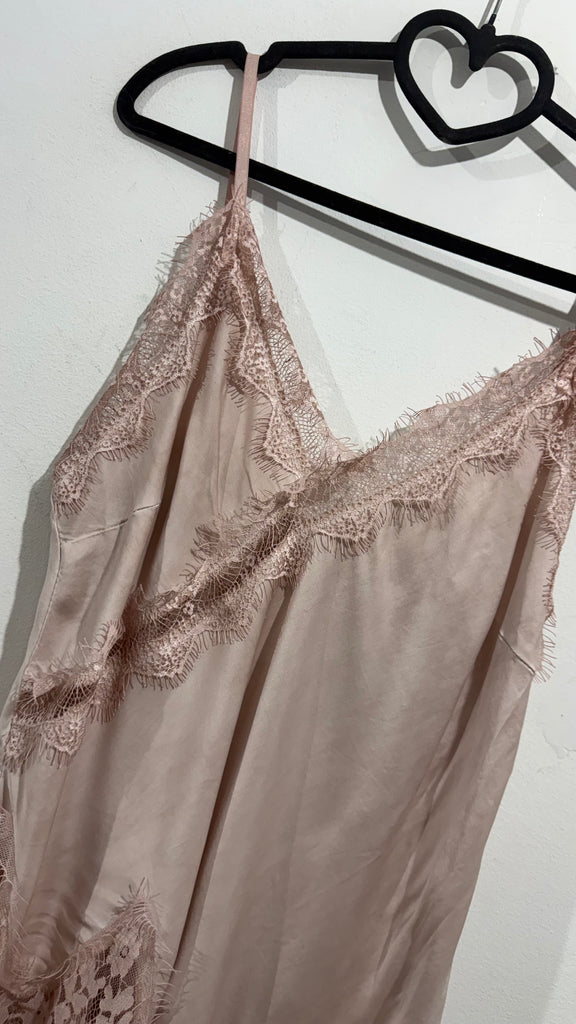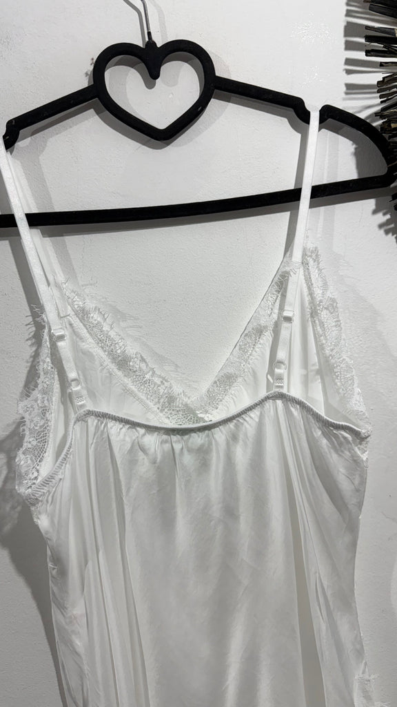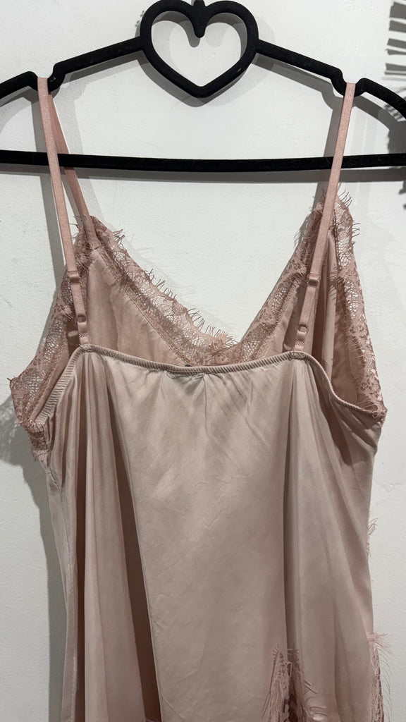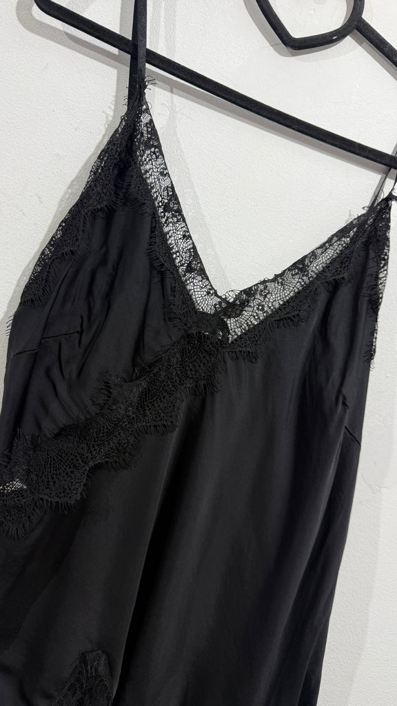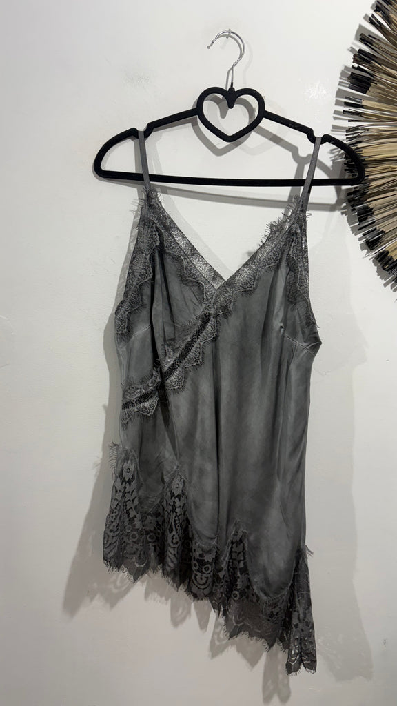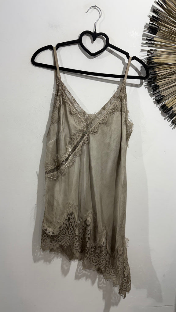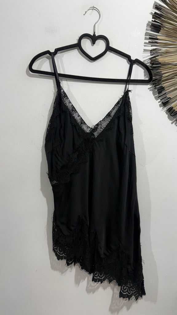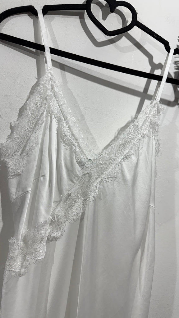 Top lencero satinado. Tiene tirante fino elástico, regulable y goma en la espalda. Tiene blonda lencera en parte delantera del escote y en el bajo. Es asimétrico.