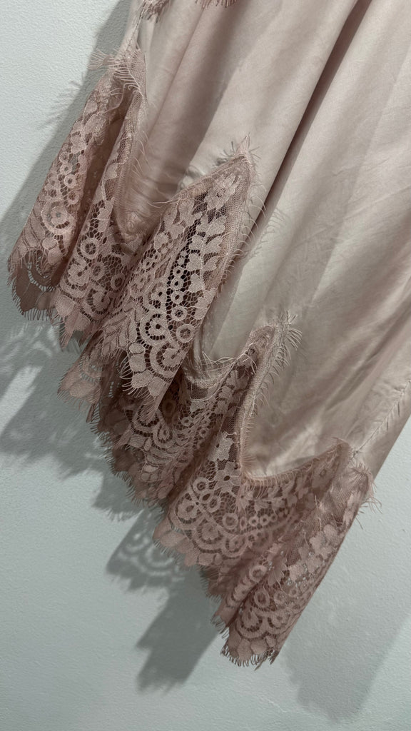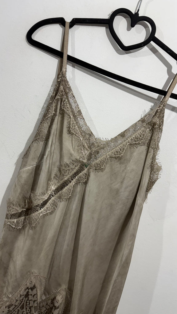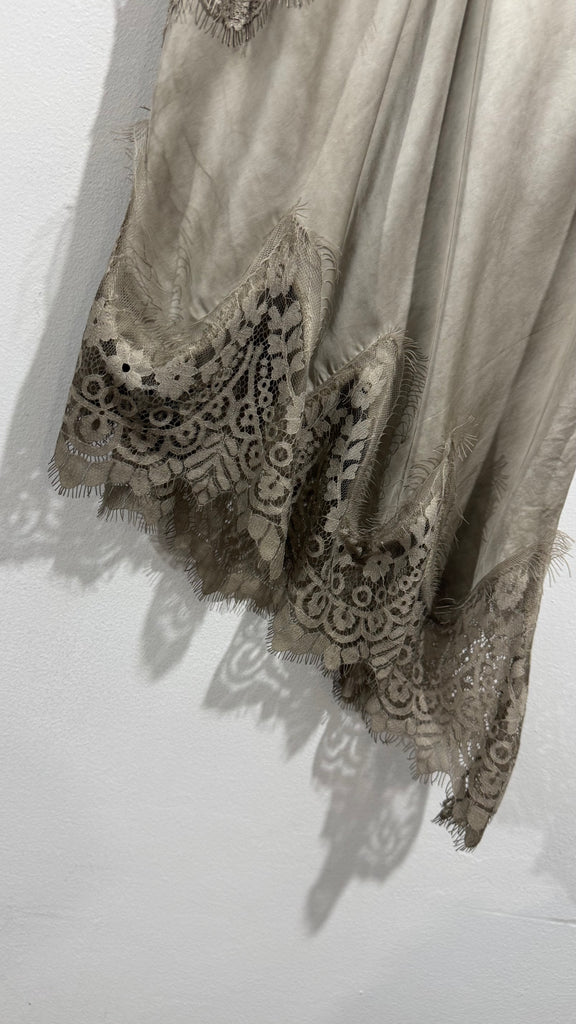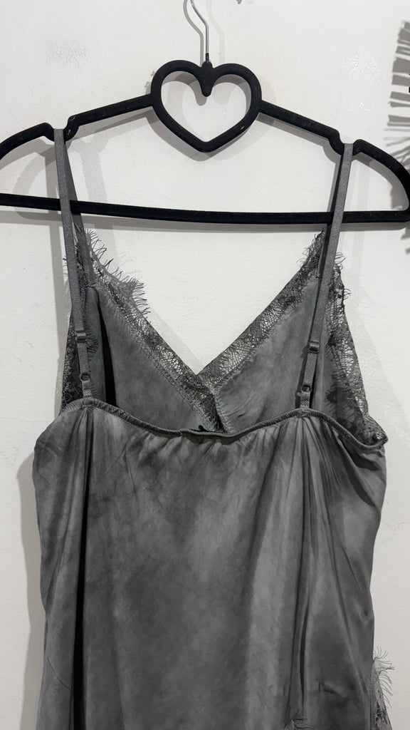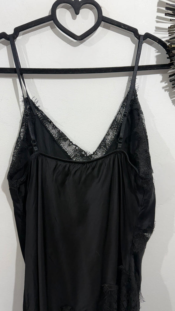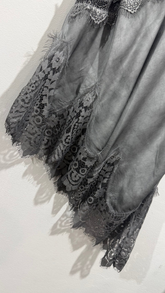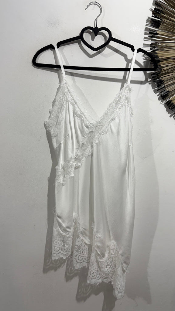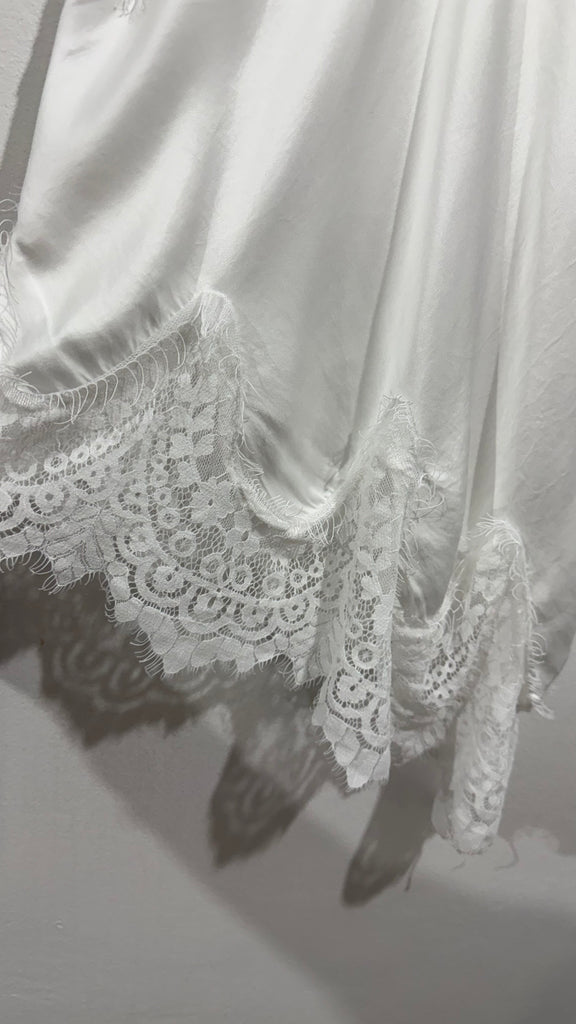 Top lencero satinado. Tiene tirante fino elástico, regulable y goma en la espalda. Tiene blonda lencera en parte delantera del escote y en el bajo. Es asimétrico.
