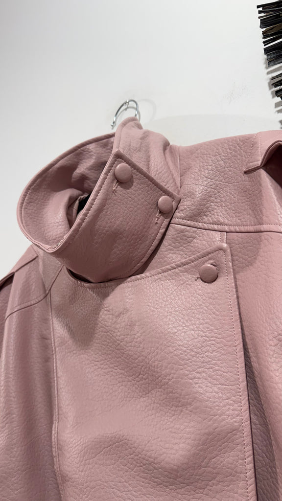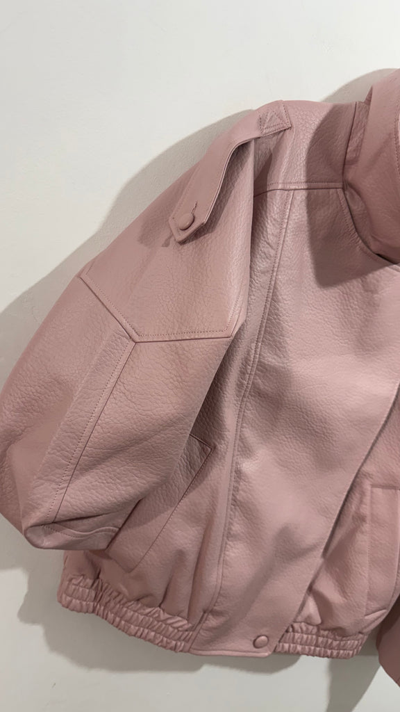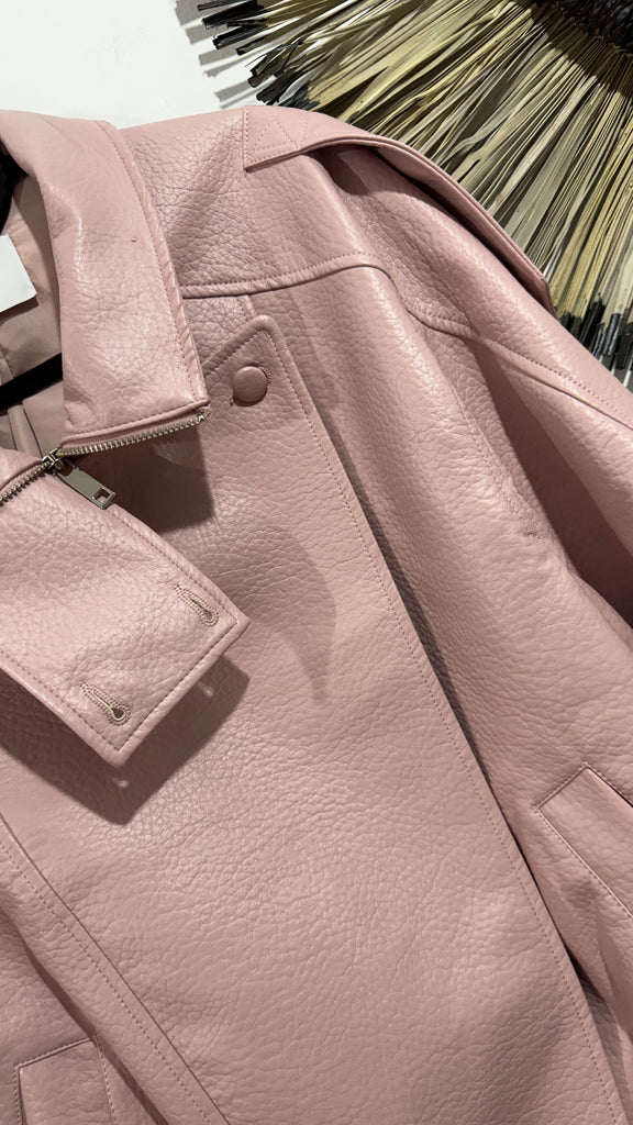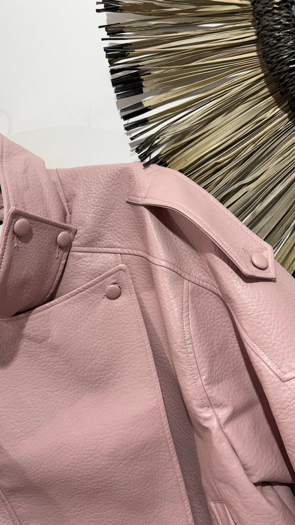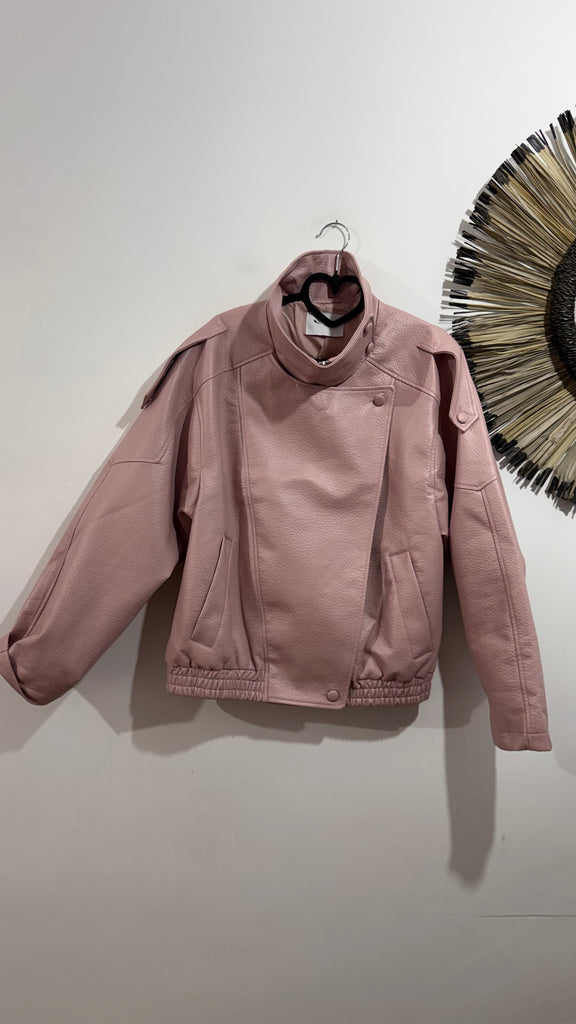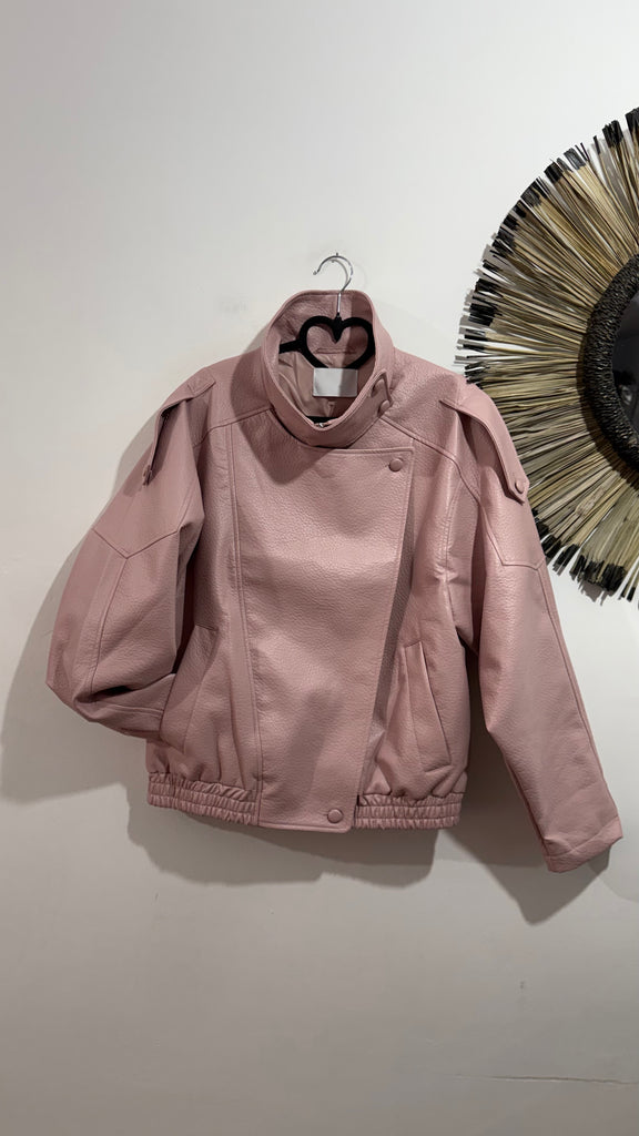 Chaqueta Biker de Ecopiel en color rosa empolvado. Es de corte recto y oversize. Tiene el bajo elástico con goma. Cremallera en parte central con solapa cruzada. Tirilla de cuello con dos botones forrados. Tiene bolsillos laterales y por dentro va forrada de tela.