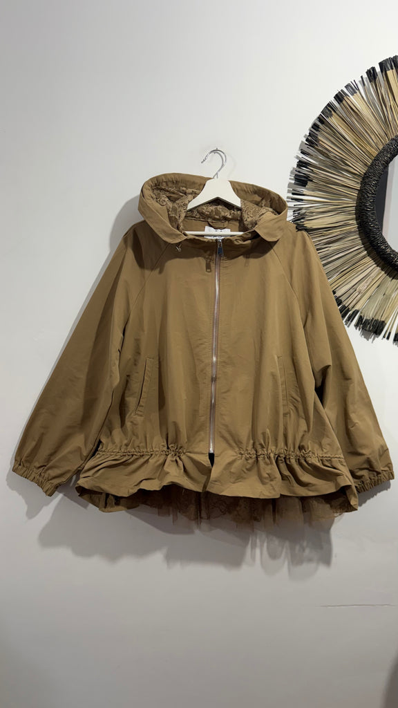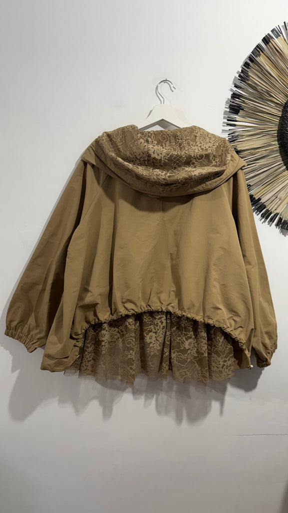 Chaqueta de tejido impermeable en color Camel. Tiene capucha y lleva detalles de blonda de encaje en el mismo tono. Tiene bolsillos laterales y el bajo y la parte de atrás lleva blonda en color Camel. En la parte de atrás lleva unos frunces con goma para poderlo ajustar.