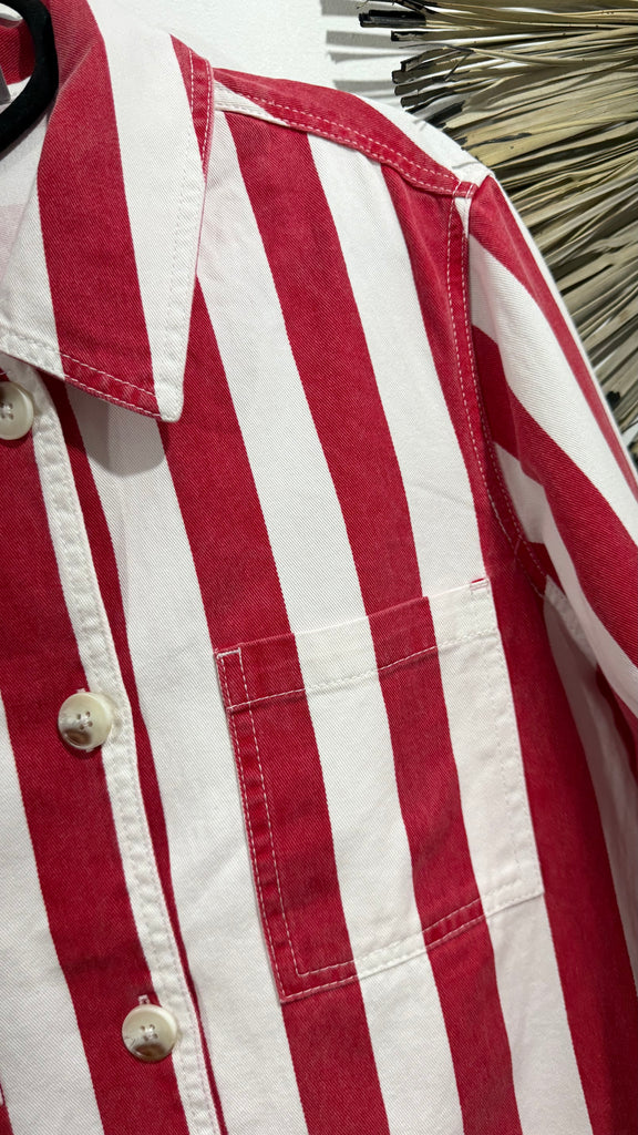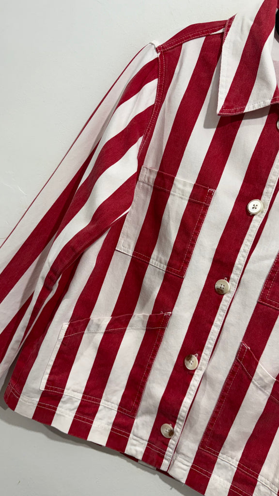 Chaqueta fina vaquera a rayas vertical en blanco y rojo Lavado. Cuello con solapa, abotonada en parte delantera y bolsillos en parte frontal. No tiene elastano.