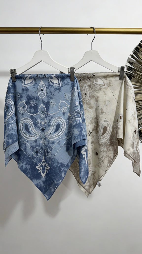 Pañuelo cuadrado de algodón. Tonos azul y blanco. Tonos camel y crudo.