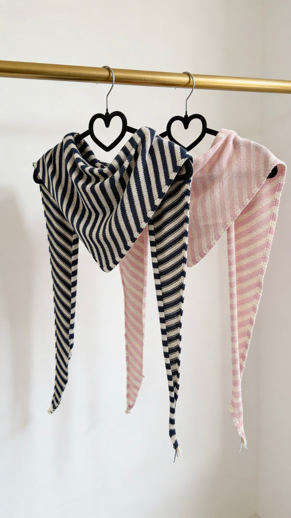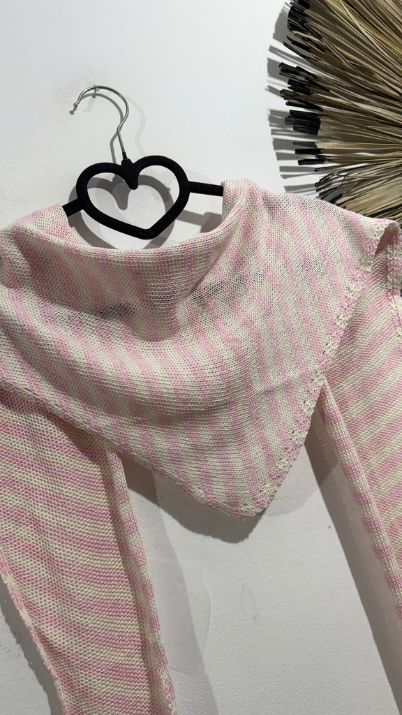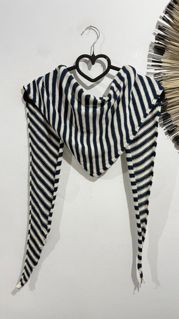 Pañuelo de punto a rayas en blanco y azul marino y e. Blanco y rosa. Corte a pico.