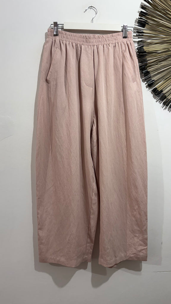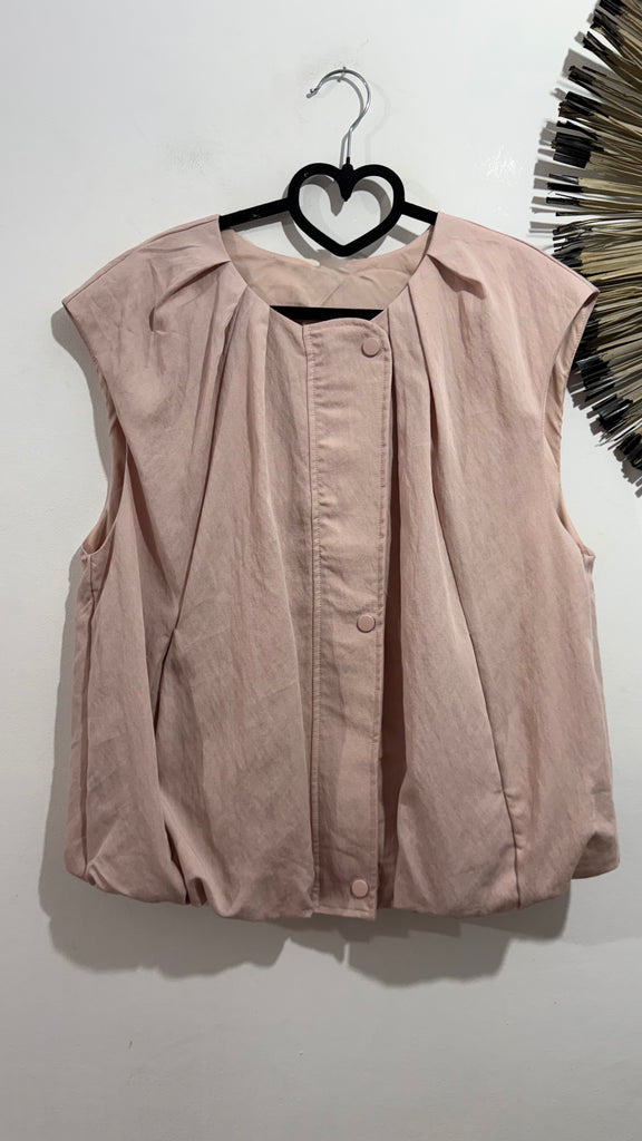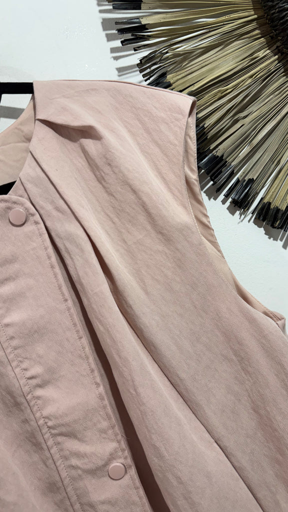 Conjunto dos piezas en color rosa. Compuesto por chaleco con cremallera en parte central y botones de tipo automático. Tienebajo elástico y bolsillos laterales. Cuello mao. El pantalón es de corte barrel con goma en la cintura, bolsillos laterales y bolsillos en parte trasera.