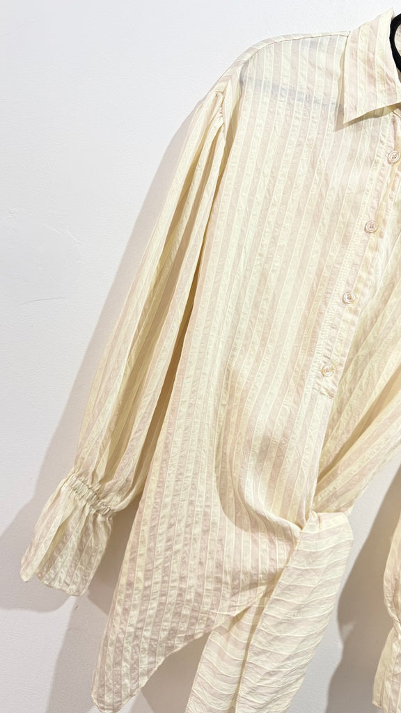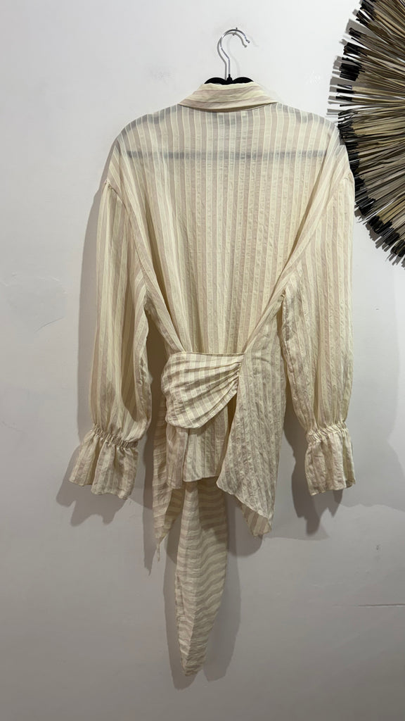 Blusa en color beige a rayas en color rosa empolvado. Cuello con solapas, botones en parte delantera y nudo a un lateral. Puños con goma y mini volante.