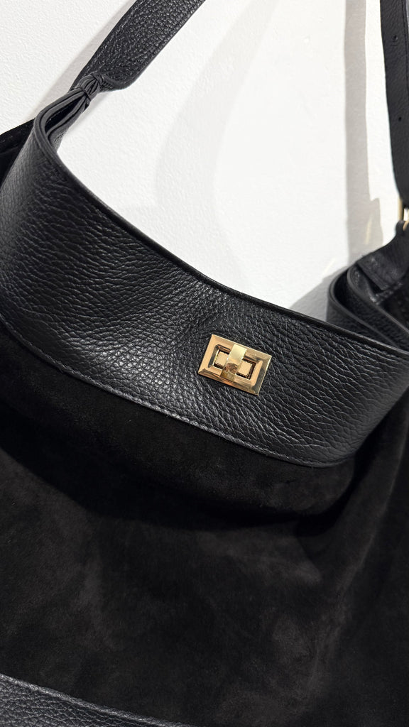 Bolso de ante combinado con cuero en color negro. Tiene cierre dorado y asa de hombro regulable con hebilla dorada. Por dentro va forrado de tela con bolsillo interior.
