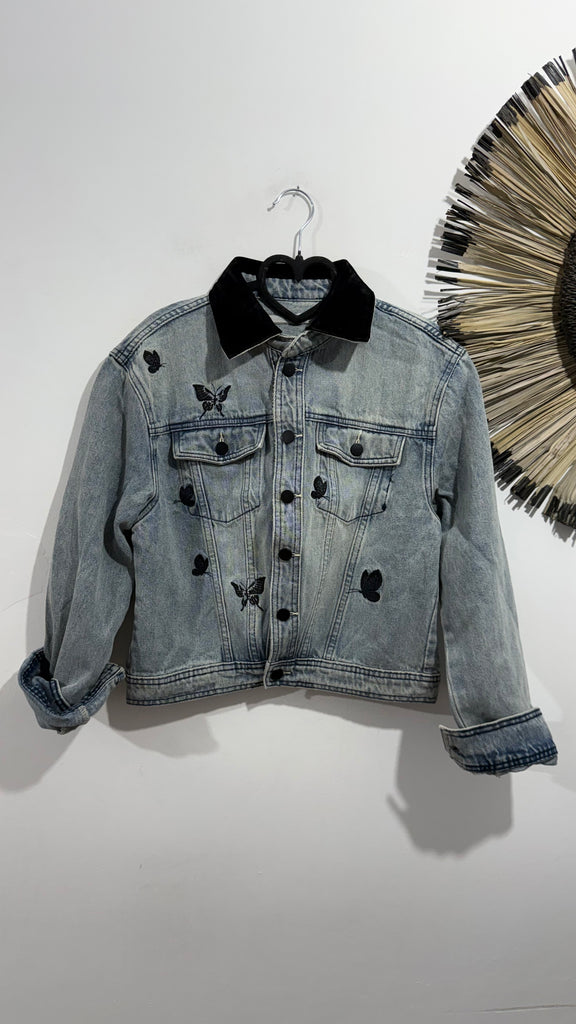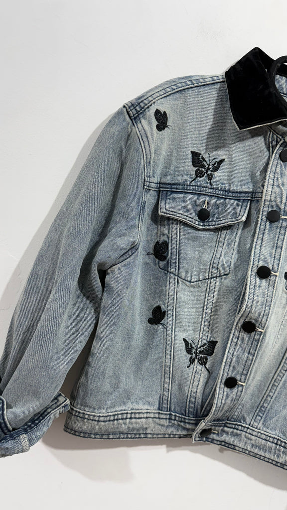 Cazadora vaquera en tono medio claro. Botones de automático en parte frontal delantera color negro, solapas de cuello de Angelina en color negro y lleva bordados a mano de mariposas con hilo negro.