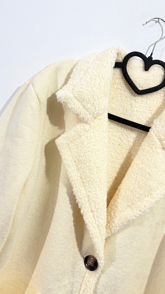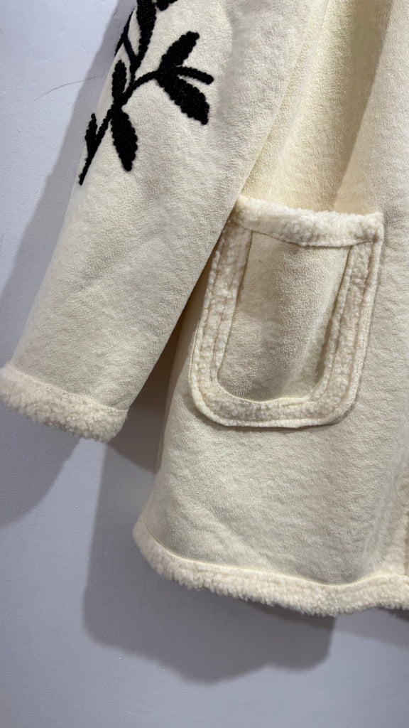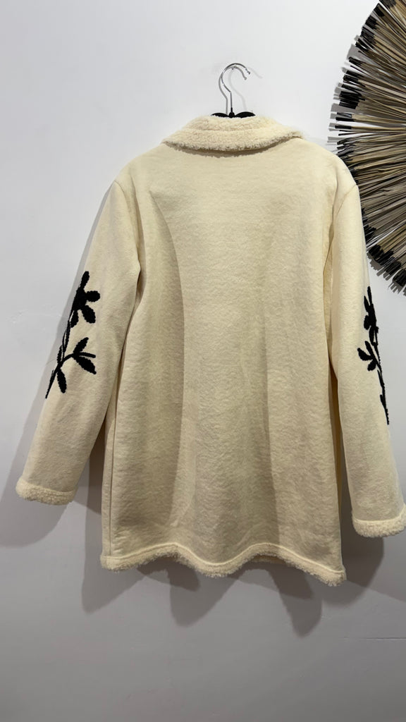 Chaqueta de Antelina combinada con borreguito en color crudo. Es súper calentita, abotonada en parte delantera y bolsillos En parte frontal. Lleva bordados en negro en las mangas.