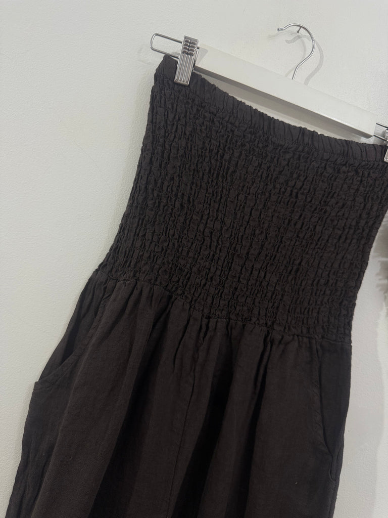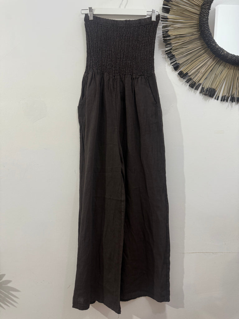 Mono de Lino 100% en color marrón chocolate. Es palabra de honor con nido de abeja en parte del pecho hasta cintura. Es de corte recto y tiene bolsillos laterales. Es súper fresco y sienta genial.