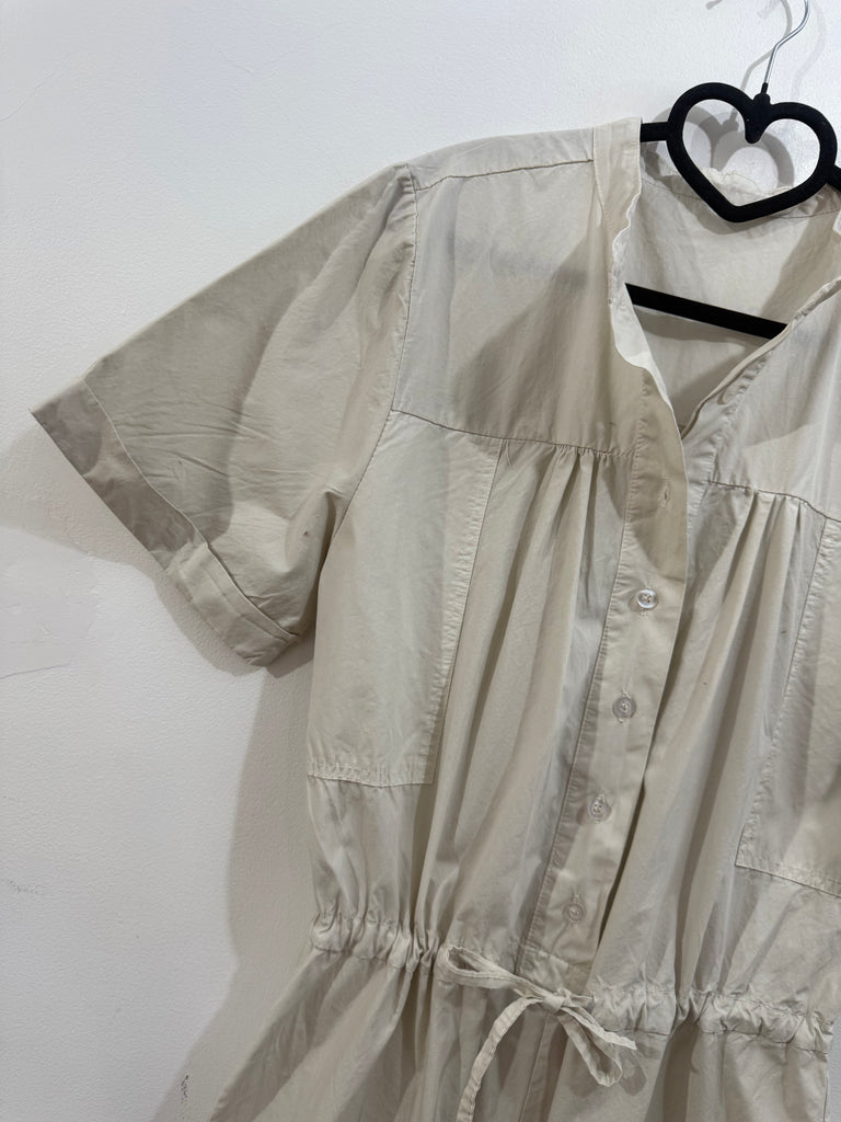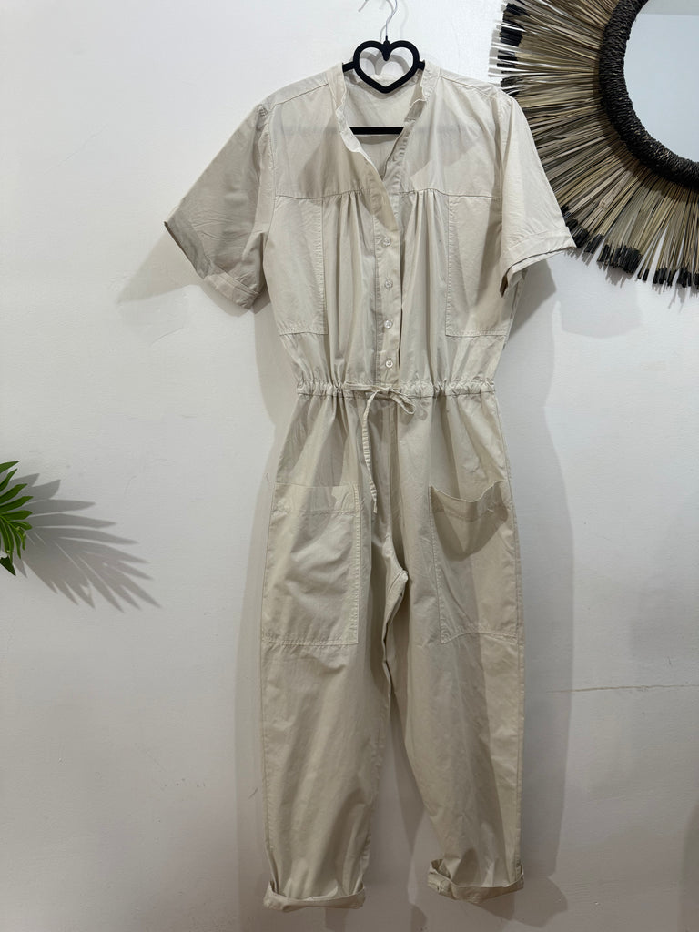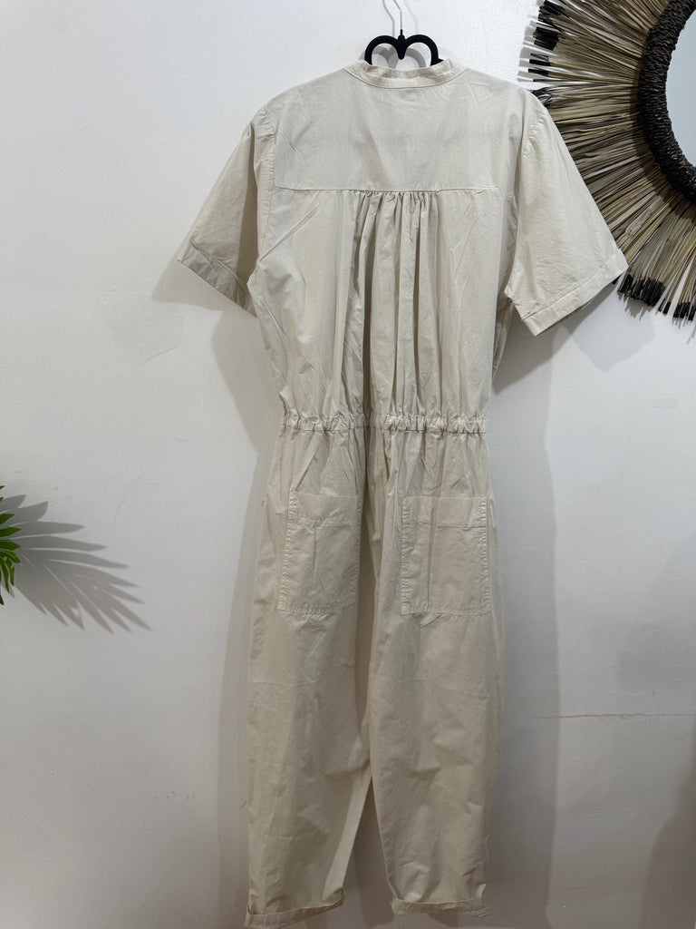 Mono de popelin en color crudo. Es finito y súper fresco. Cuello mao, manga corta y abotonado en parte delantera. Lleva cordón en la cintura para poder ajustar. Tiene bolsillos plastones en parte delantera y trasera.