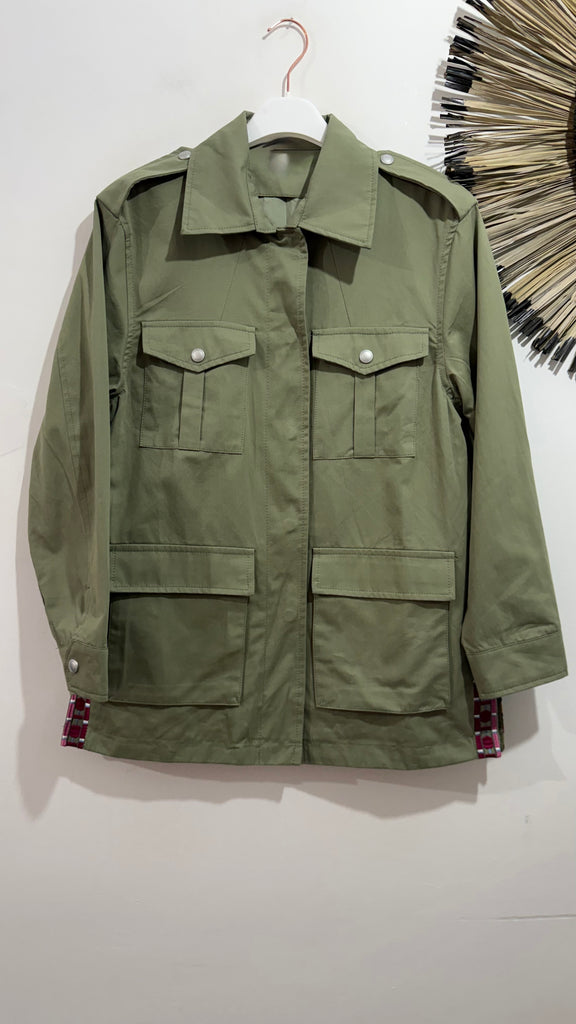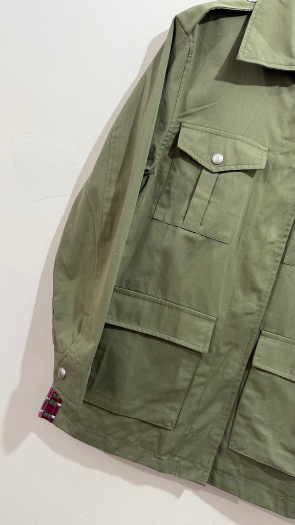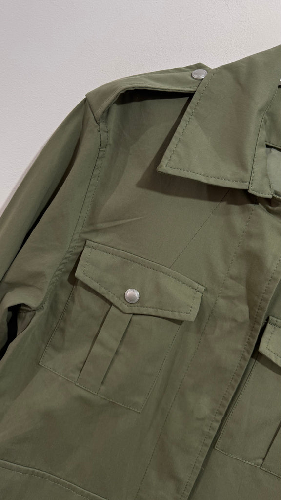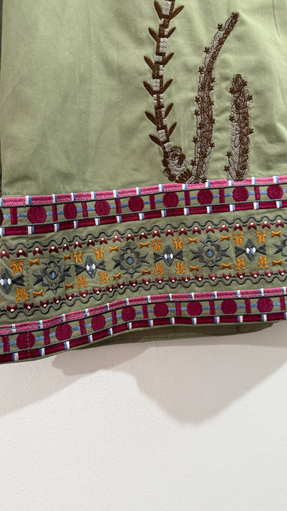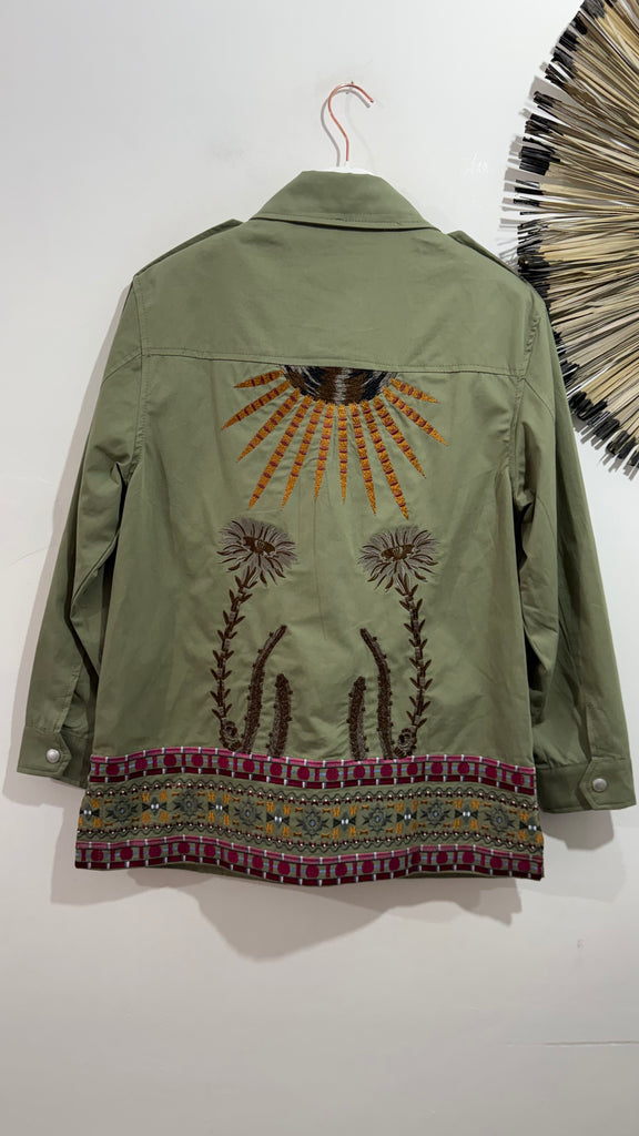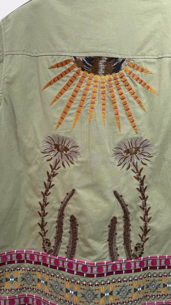 Sahariana vaquera en color caqui. Es de corte recto y tiene bolsillos plastones en parte frontal superior y en parte frontal inferior. Bordada a mano. Cuenta con bordados en aberturas laterales y toda la espalda bordada completamente a mano.