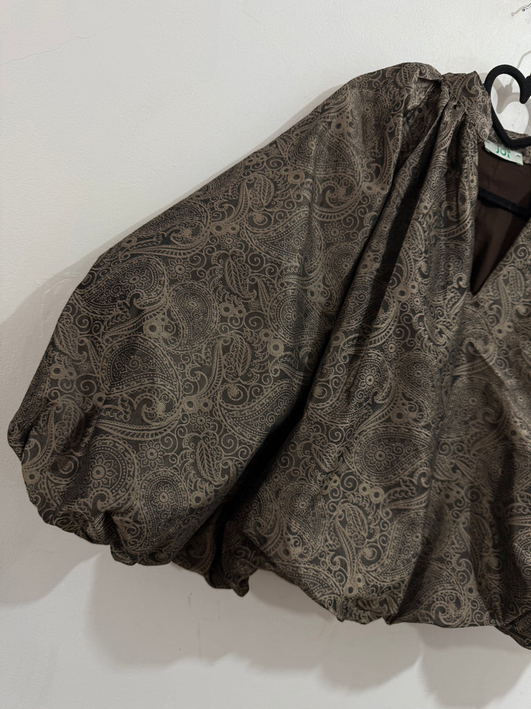 Blusa en tonos chocolate y Taupé ligeramente satinada con escote a pico, manga larga abullonada con goma en el puño y abullonada en el bajo con goma.