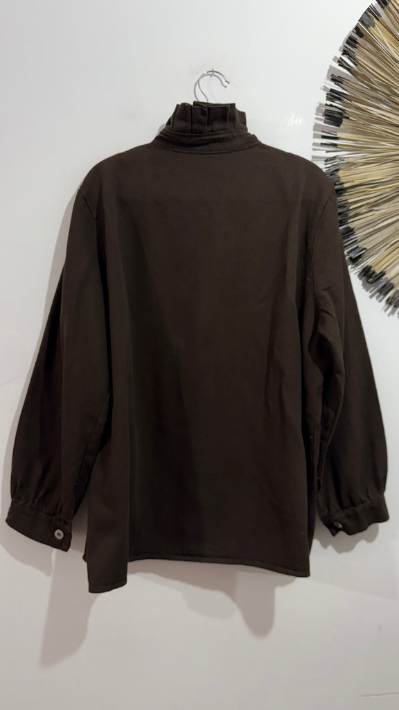 Sobrecamisa vaquera en marrón chocolate. Es de corte recto, abotonada en parte delantera y cuello mao con volante.