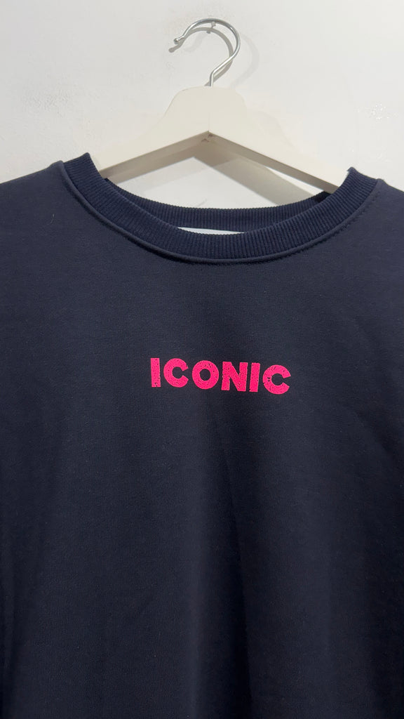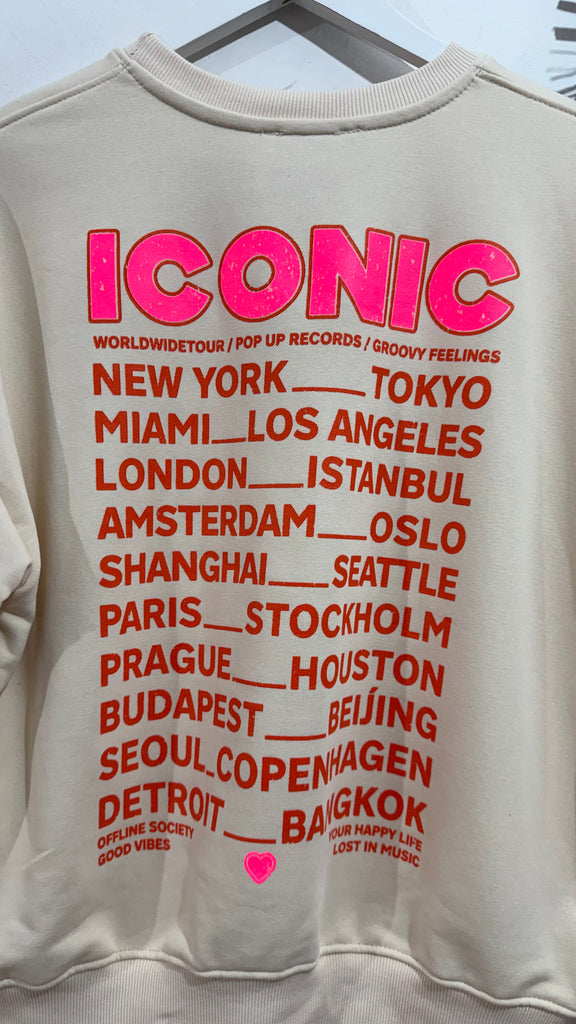 Sudadera de algodón en crudo, gris y verde agua. Lleva dibujo en rosa flúor en parte delantera y dibujo en parte trasera. Cuello redondo. Interior de felpa.