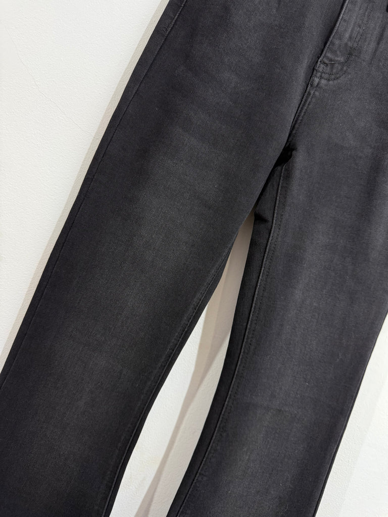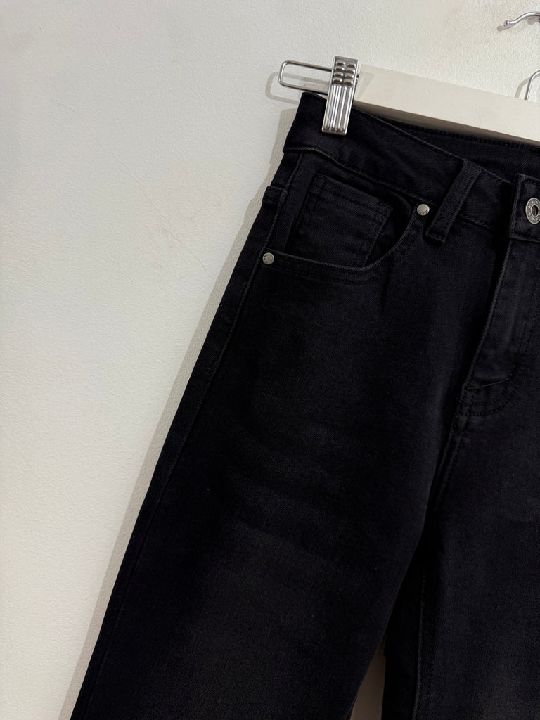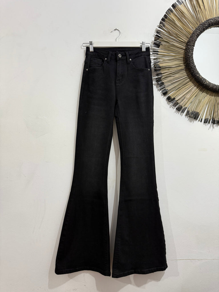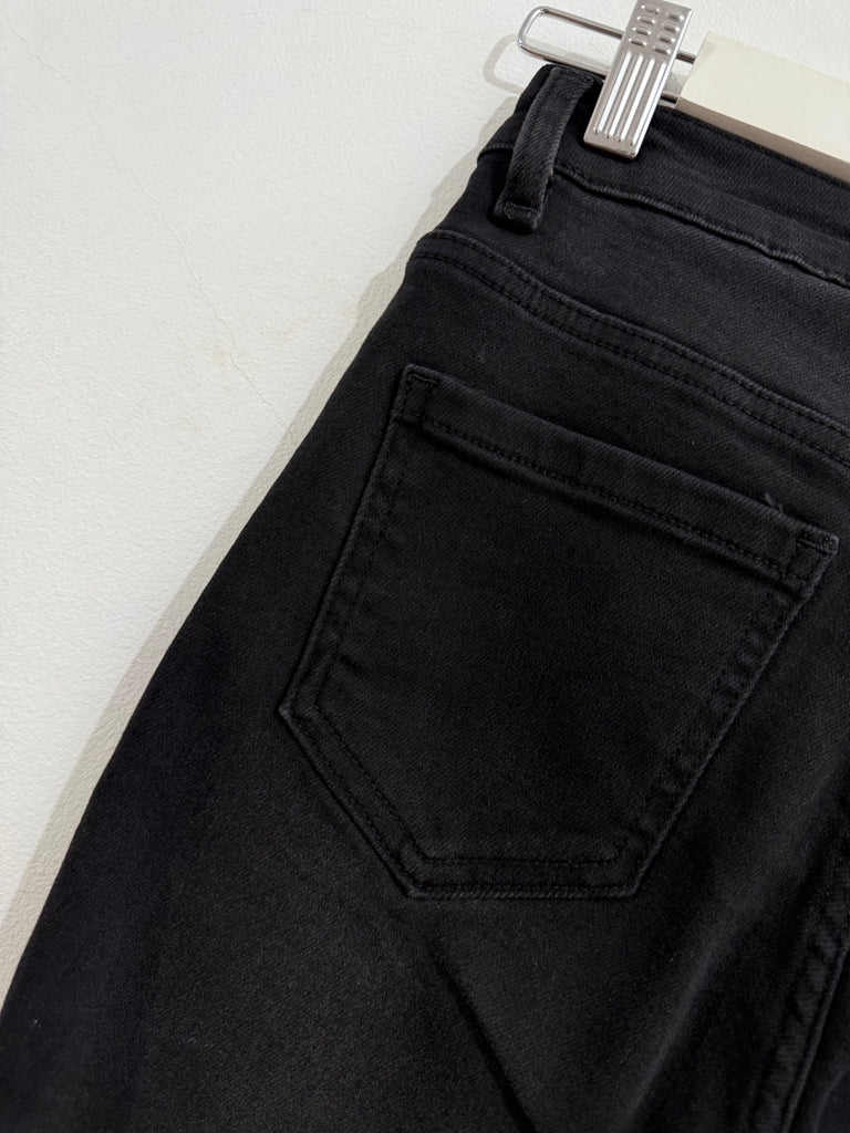 Vaquero en color negro. Es elástico de tiro medio y pegadito de pierna. Termina en una campana muy discreta. Bolsillos en parte delantera y trasera. Se adapta genial y sienta muy bien.