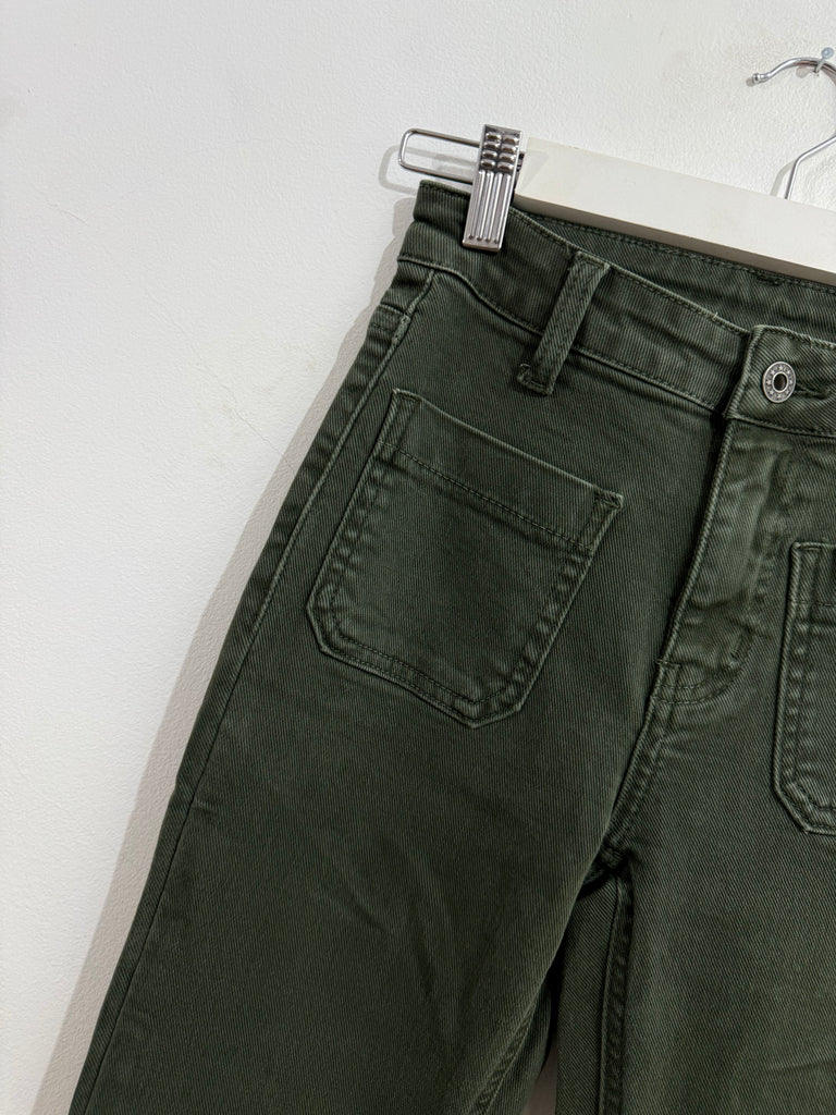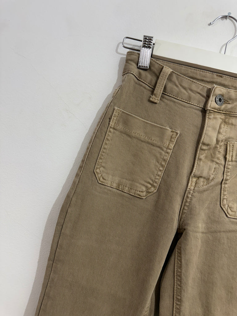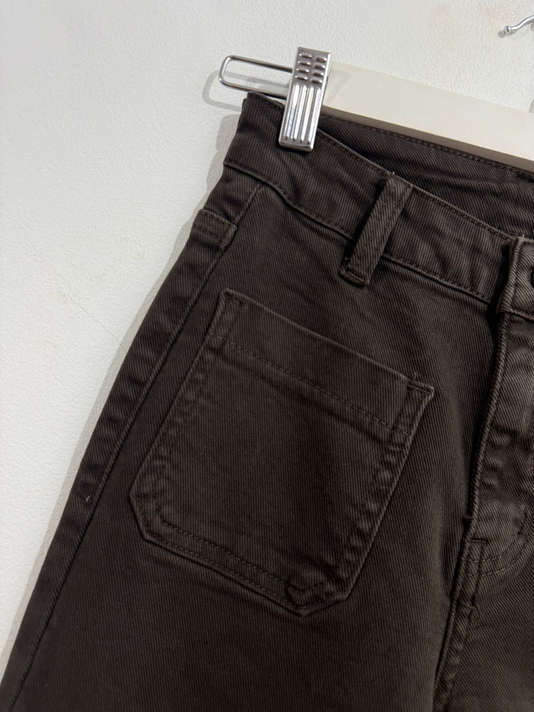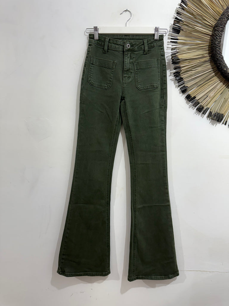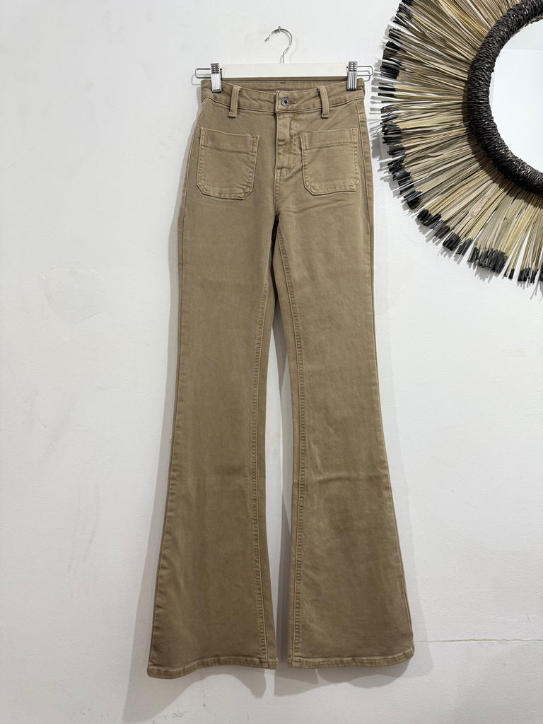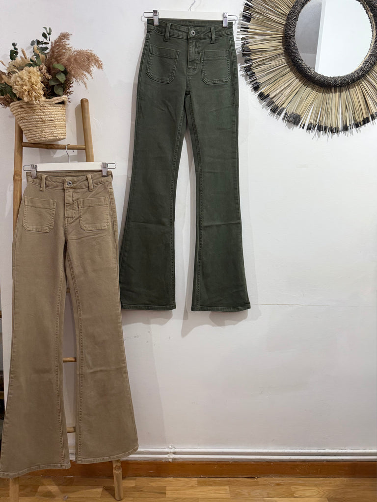 Vaquero en camel , en kaki y en marrón chocolate. Es de tiro medio. Es elastico y se adapta genial. Bolsillos en parte delantera y trasera. Pegadito de pierna y termina en una campana muy discreta.