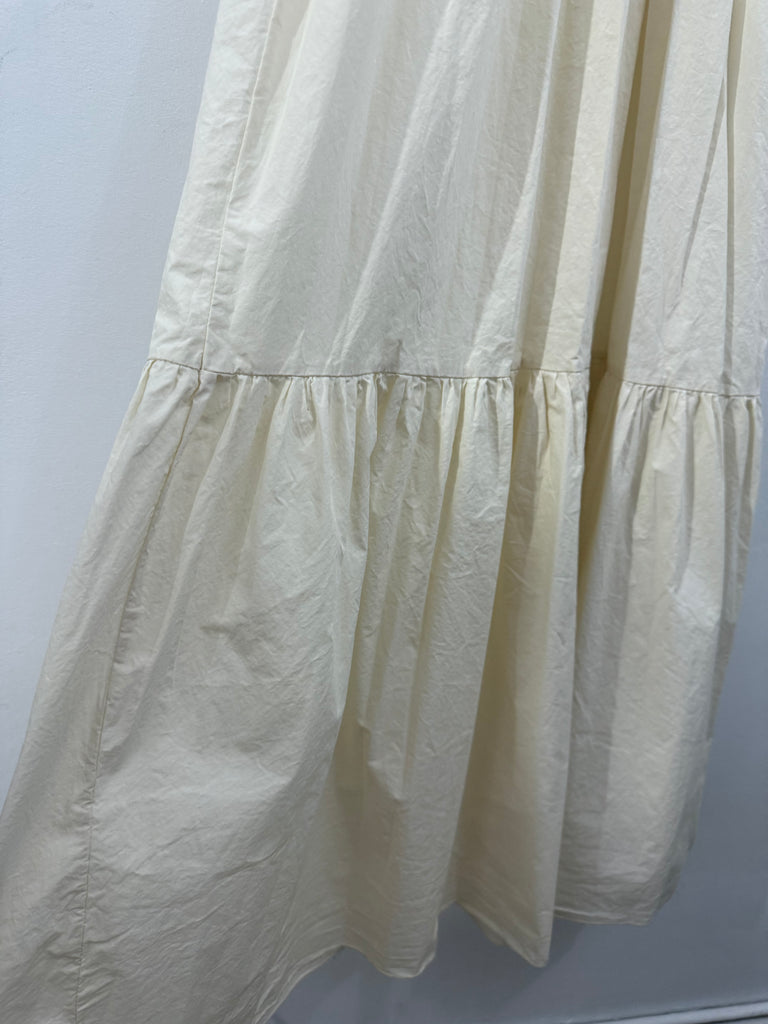 Vestido 100% de algodón en color crema. Es de tirante grueso con maxi mariposa de crochet hecha a mano en parte delantera. De la cintura hasta abajo es de volantes de popelin. Es muy fresco y cómodo.