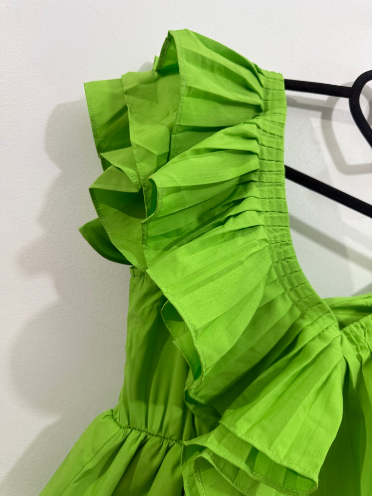 Vestido corto en color verde pistacho flúor. Tiene escote a pico plisado en parte delantera y espalda. Lleva goma debajo del pecho y tiene forro interior.