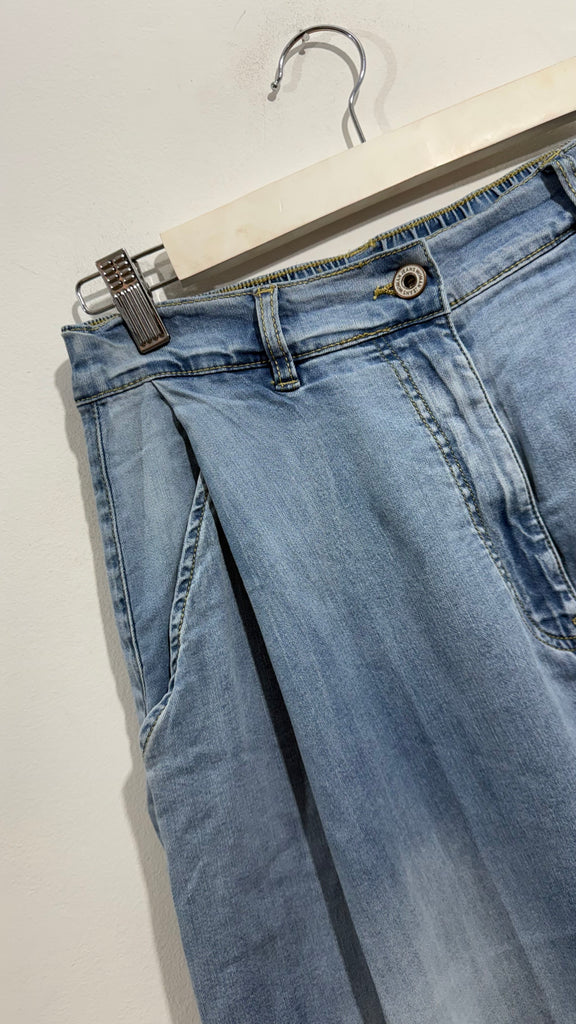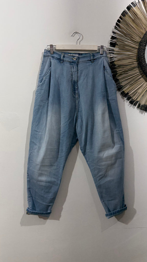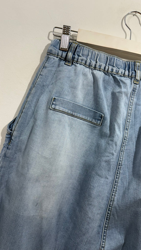 Vaquero en tono medio/claro de tipo baggy con pinzas en parte delantera. Tiene bolsillos laterales y falsos bolsillos tipo chino en parte trasera. tiene goma en la cintura en la parte de atrás.