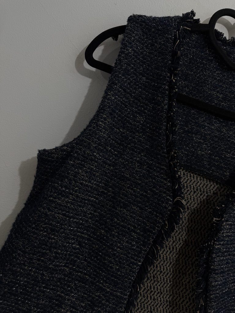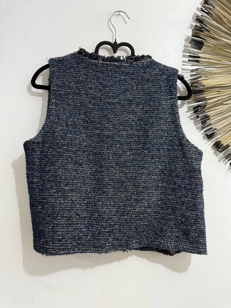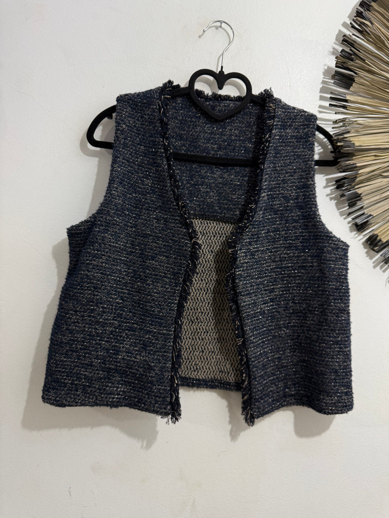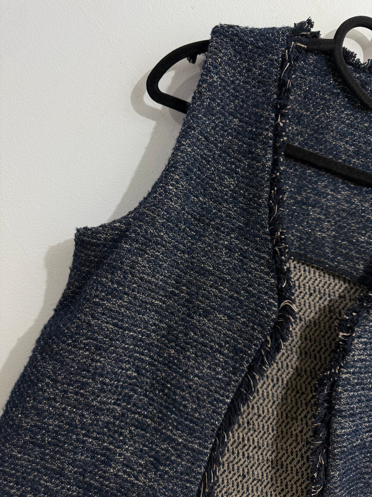 Chaleco de tela gruesa en color azul marino. Es desflecado.