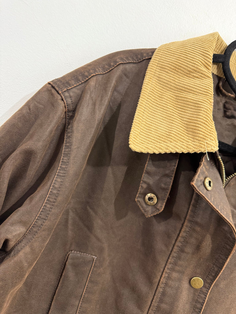 Parka encerada en color marrón chocolate. Por dentro va forrada de guata, es alcolchada  y calentita. Es de corte recto con solapas del cuello de pana en mostaza. Tiene bolsillos plastones en parte frontal y bolsillos a los laterales a la altura del pecho, clegre con crwmallera y botones. Lleva Maxi pinza abierta en la espalda.