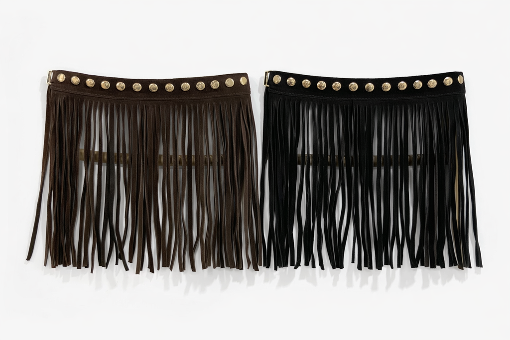 Cinturón de ante en color Moka. Tiene flecos y tachas doradas.