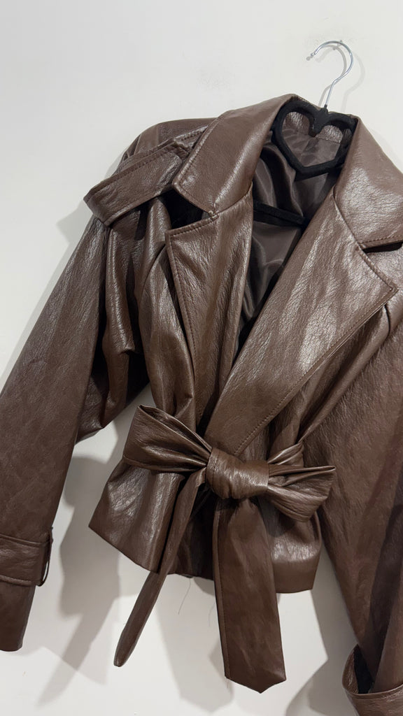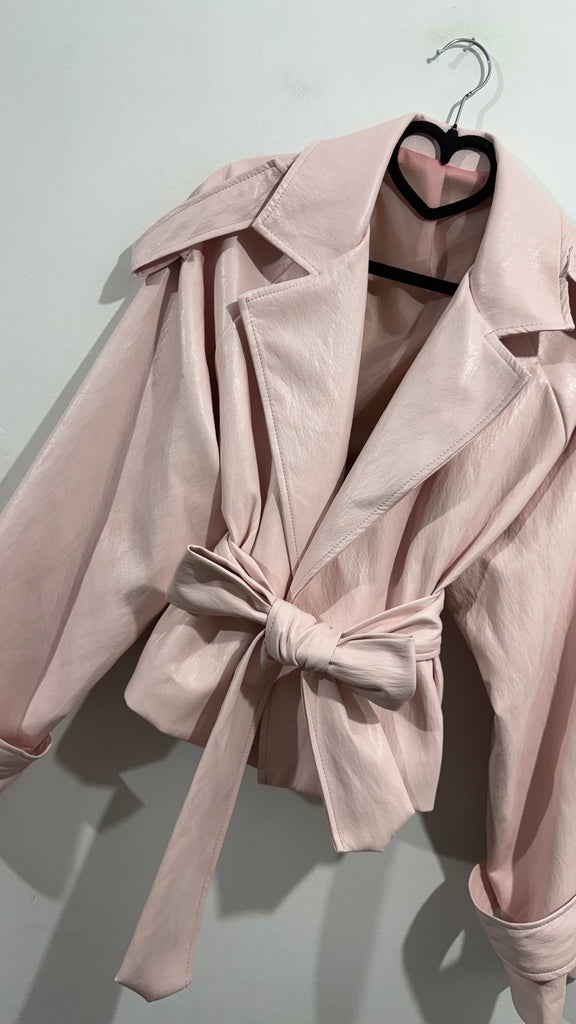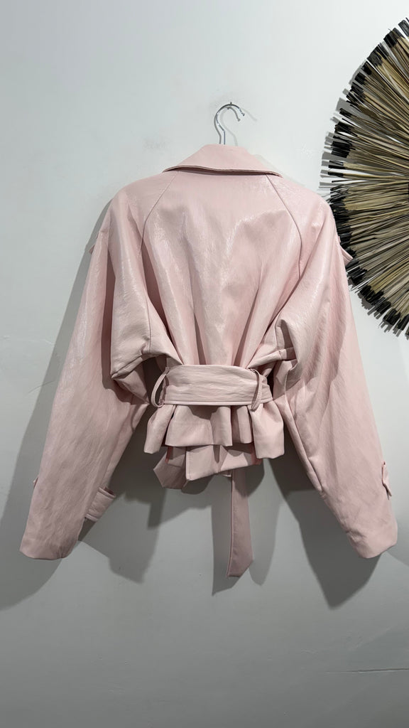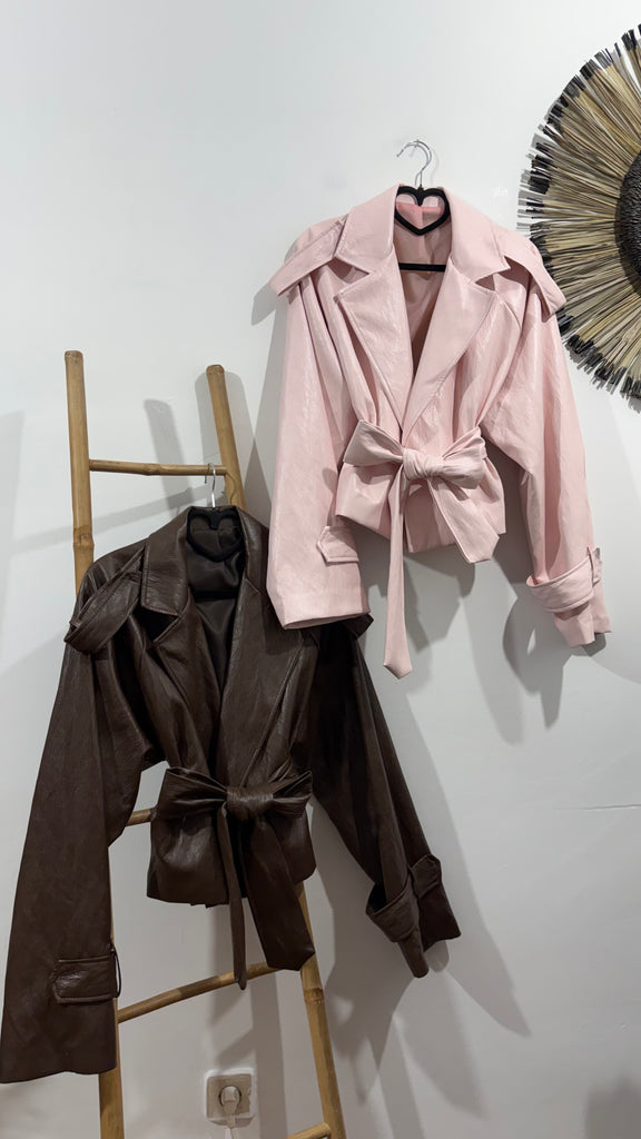 Biker de polipiel en color rosa y en marrón chocolate. Son cortitas con cinturón y manga rangla. Por dentro va forrada de tela.