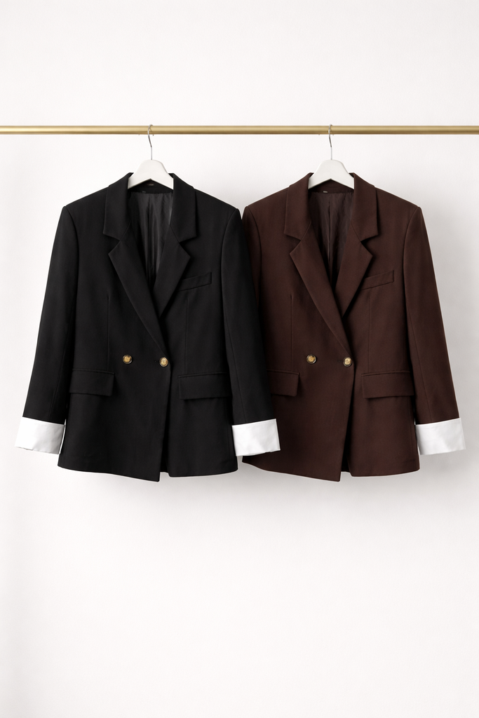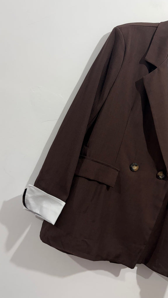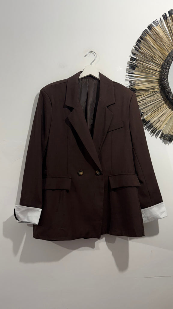 Blazer de corte recto estilo oversize en chocolate y negro. Botones en parte delantera y detalles de puños camiseros de popelin en color blanco.