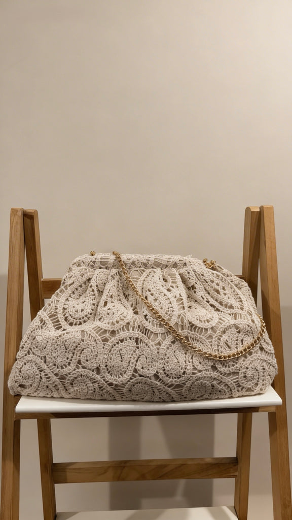 Bolso de tejido guipur en color crudo. Tiene cierre a presión y tiene cadena de bandolera. Por dentro va forrado de tela de algodón y tiene bolsillo interior.