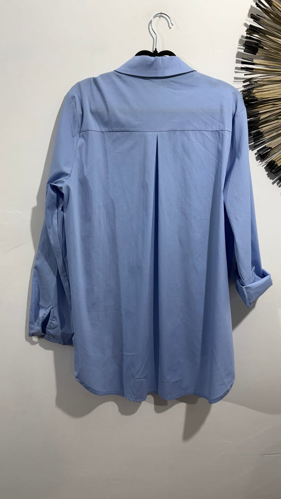 Camisa básica de popelín y elastano en color azul. Abotonada, parte delantera, cuello, camisero y tiene el estado. Es larguita.