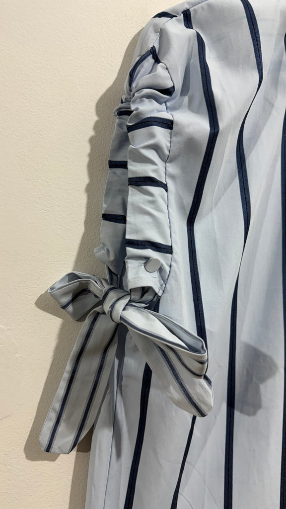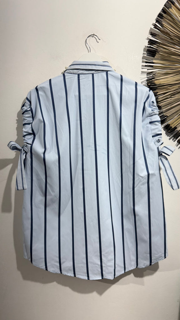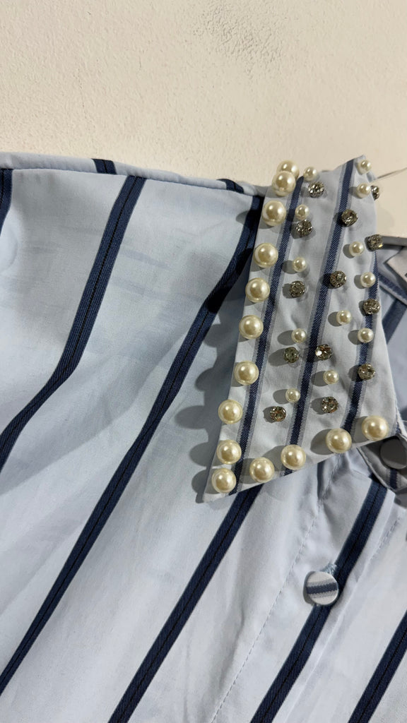 Camisa de popelin a rayas en azul marino y azul clarito. Cuello con solapas. Tiene perlas y piedras de Strass en las solapas. Lazo en las mangas.con botón para ajustar. Botones en parte delantera.