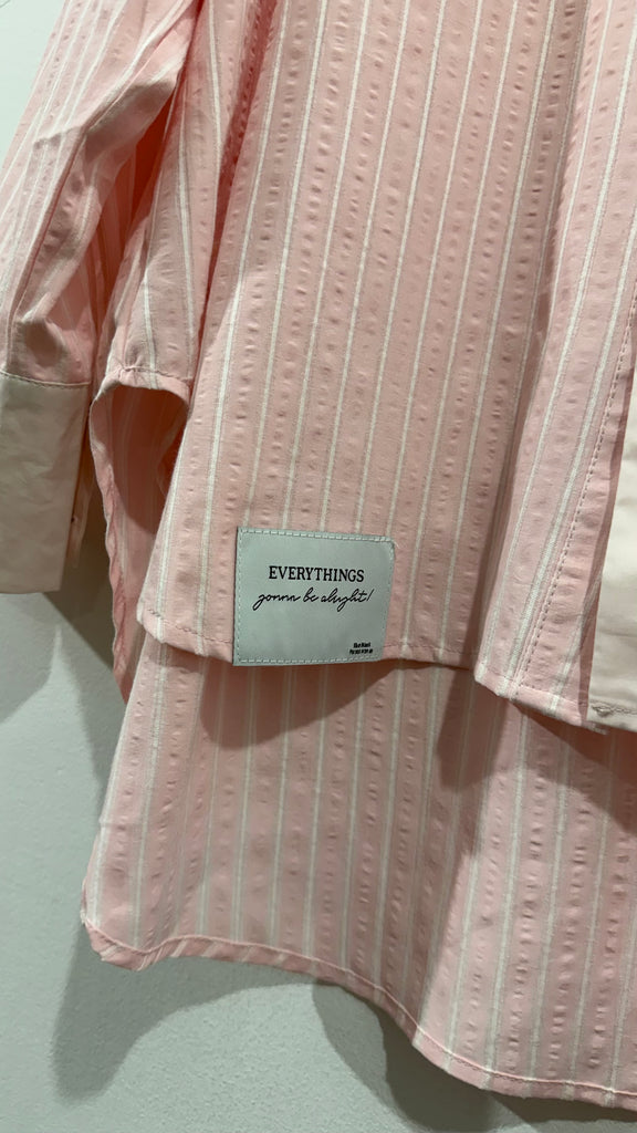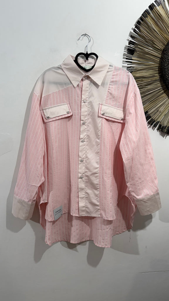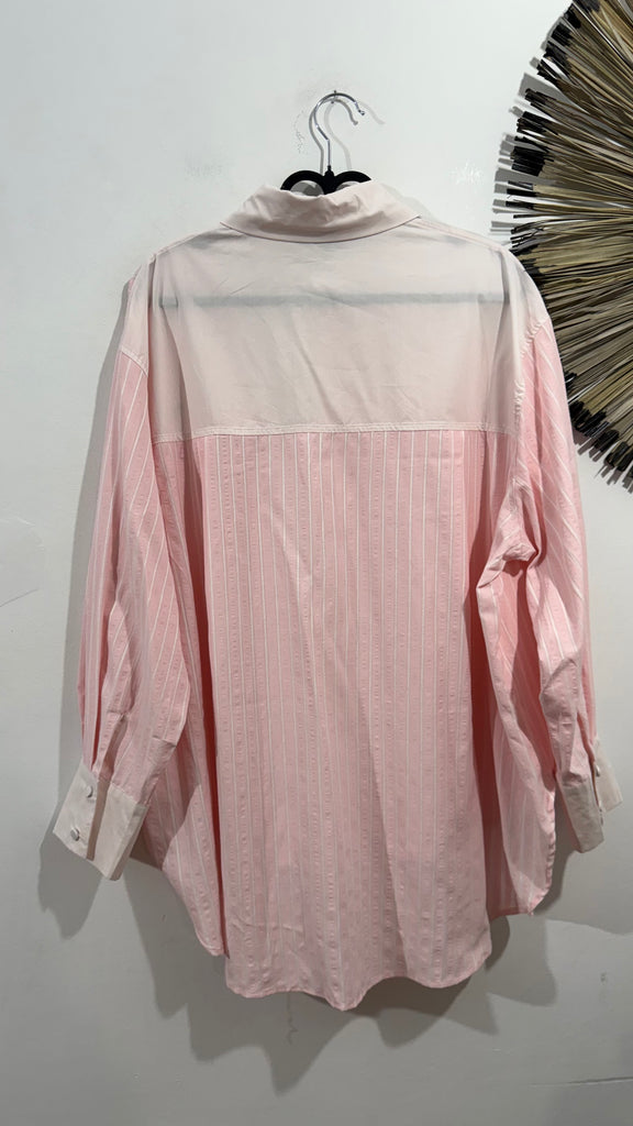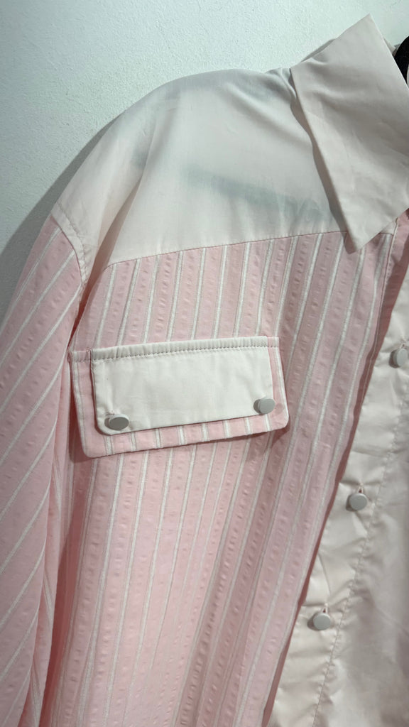 Camisa de corte Oversize en tonos rosas. Combinando popelín y tejido tipo bámbula a rayas en tonos claros. Va abotonada en parte delantera. . Tiene bordado un lateral,cuello con solapas y bolsillos. Plastones con solapa en parte delantera. Tiene parche en el bajo.