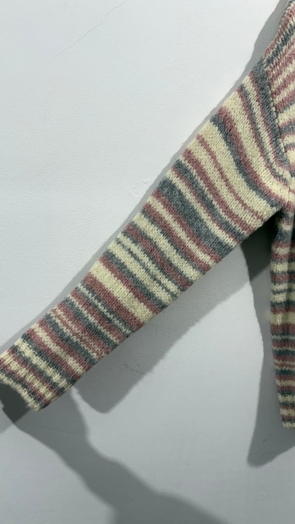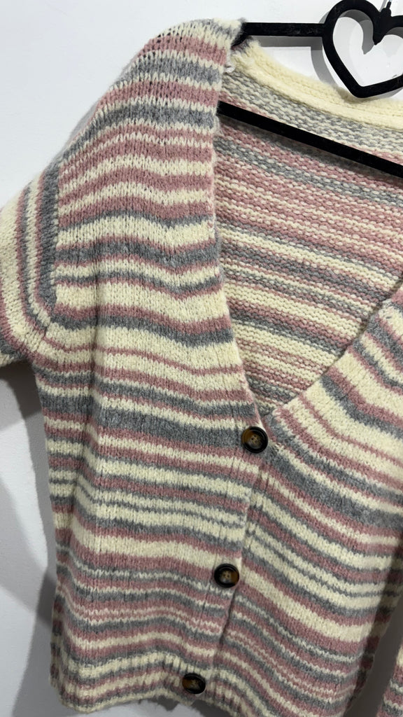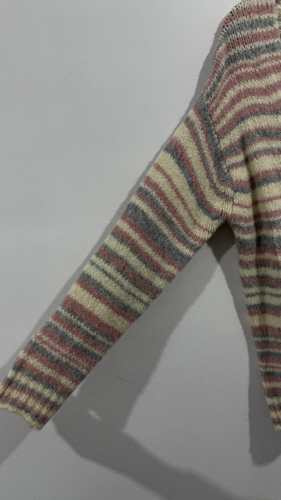 Cárdigan grueso en color crudo, con rayas horizontales, en rosita clarito y en gris clarito. Tiene el cuello redondo y es larguito.