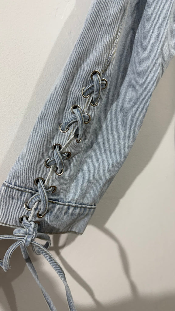 Cazadora vaquera en tono clarito. Lleva cuerdas tipo corsé en hombros, parte delantera y trasera. No tiene elastano. Abotonada en parte delantera y cuello con solapas.