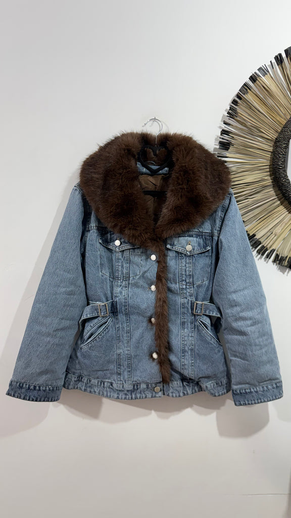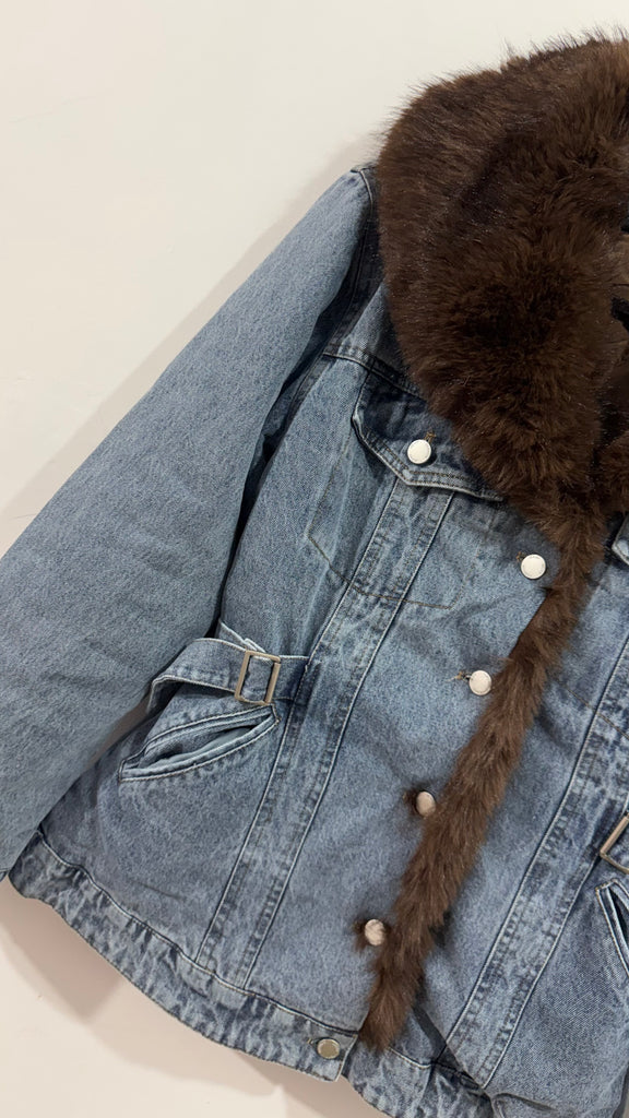Cazadora vaquera en tono medio. Abotonada en parte delantera combinada con pelo sintético ecológico en solapas y parte delantera alrededor de los botones en color marrón chocolate. Por dentro va guateada en cuerpo y mangas. Tiene botones en parte delantera y hebillas a los laterales de la cintura para poder ajustar.(Las prendas de pelo natural o sintético e ecológico, no admiten cambios)