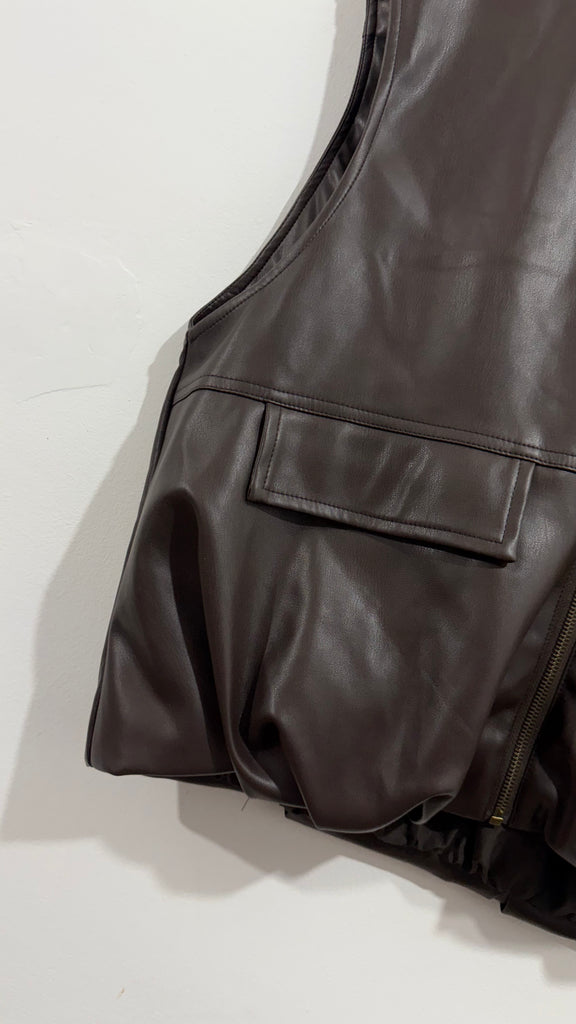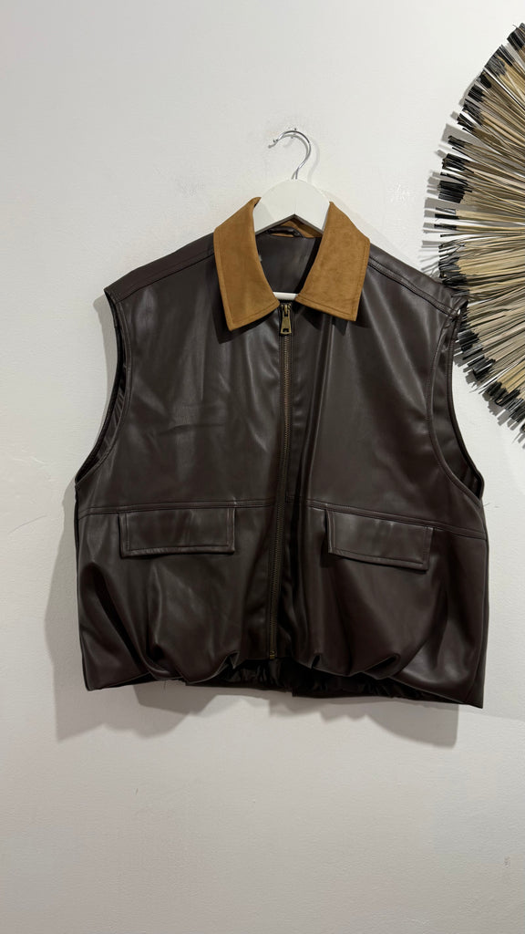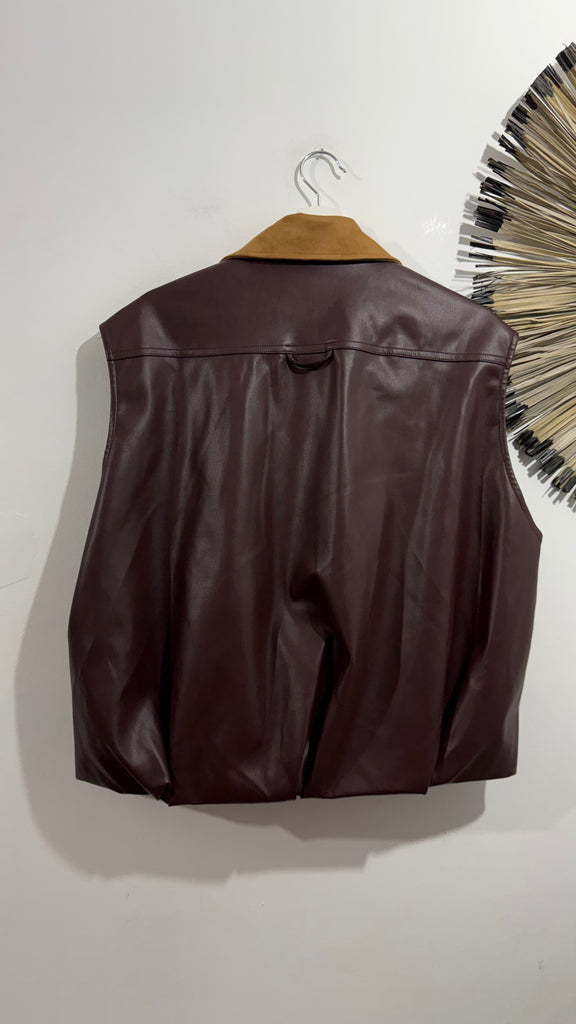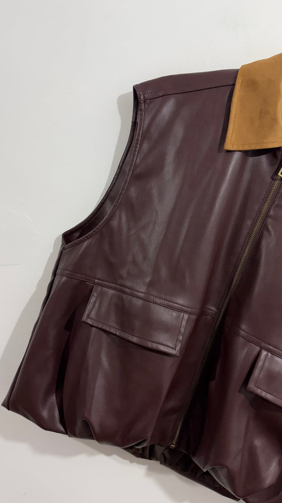Chaleco de ecopiel en marrón chocolate con solapas de Antelina en camel y en granate con solapas Camel. Por dentro fa borrado de tela. Bajo abullonado con goma. Bolsillos laterales.