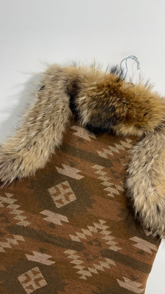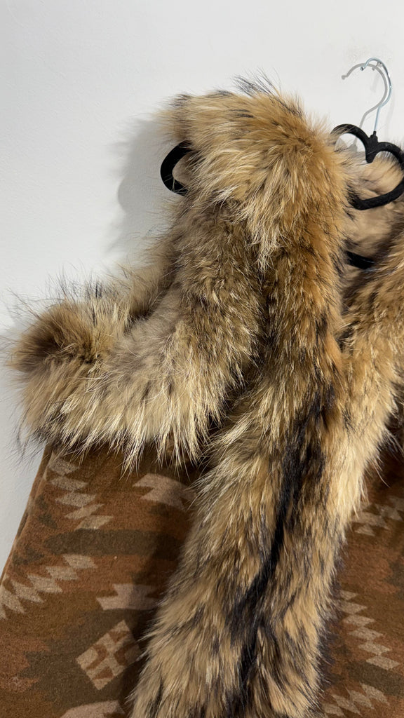 Chaleco largo edición limitada completamente hecho a mano con estampado étnico combinado con pelo natural de marmota en parte delantera, mangas, cuello y bajo. Por dentro va forrado de tela y tiene cierres de gancho en parte delantera. (Las prendas de pelo natural no admite cambios)