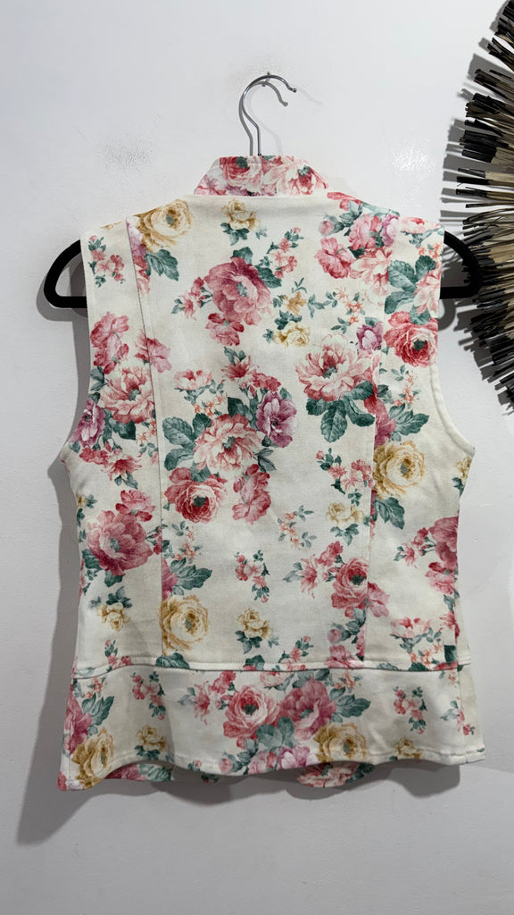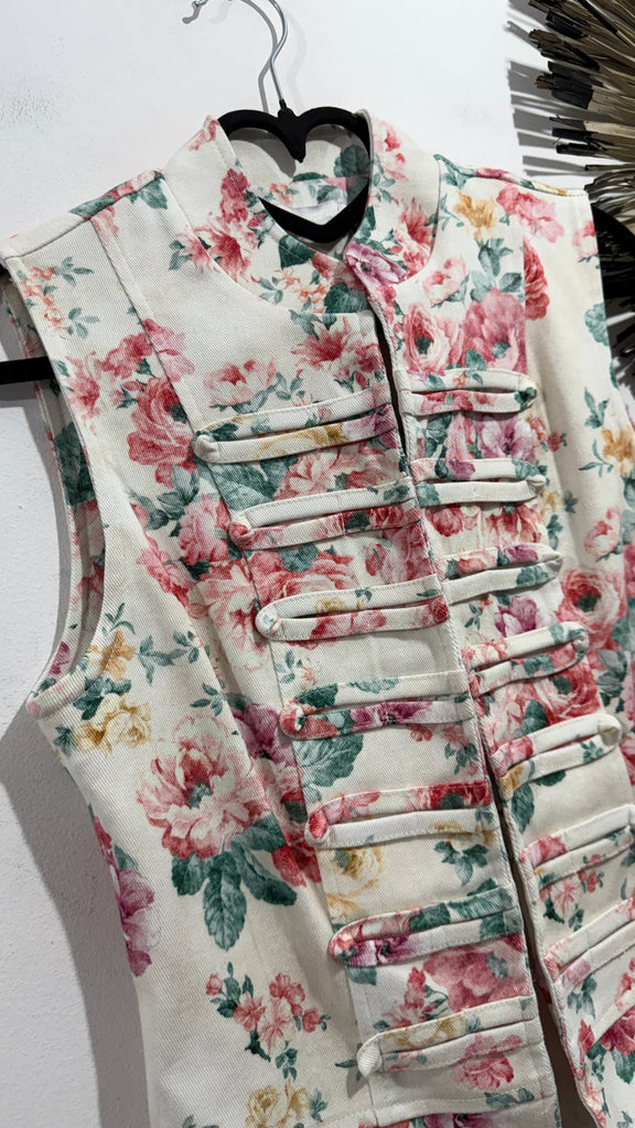 Chaleco vaquero con estalano de estilo japonés con cierre de corchetes interiores, manga tipo sisa y cuello mao. Estampado floral. Fondo crudo con flores en rosas , turquesas y mantequilla. Queda entallado.