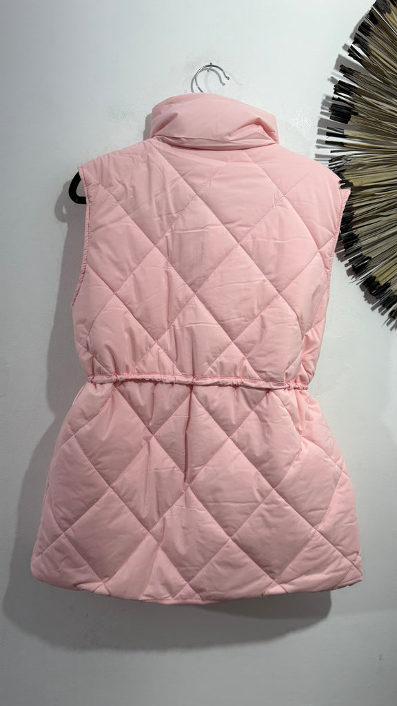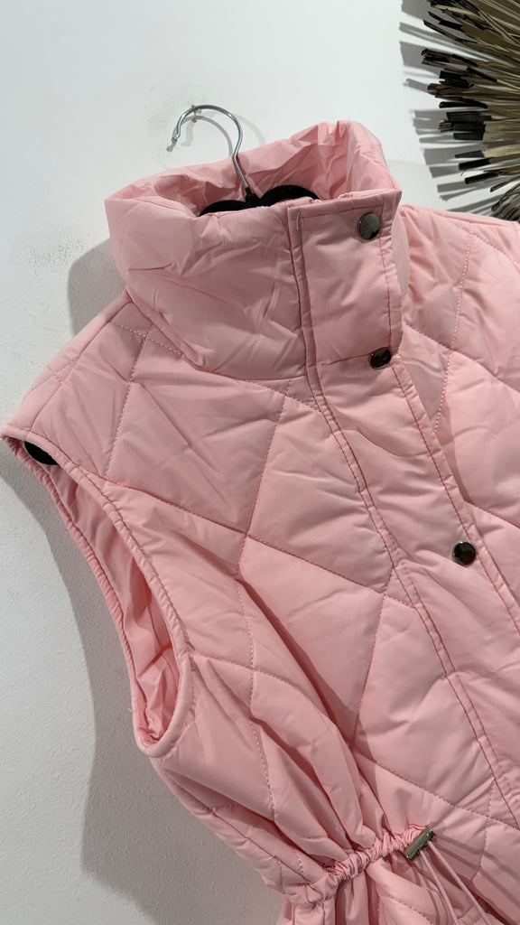 Chaleco guateado en color rosa. Es de corte recto con goma en la cintura con reguladores para poder fruncir. Tiene bolsillos en parte frontal delantera con solapa. Cremallera en parte frontal y botones de tipo automático.