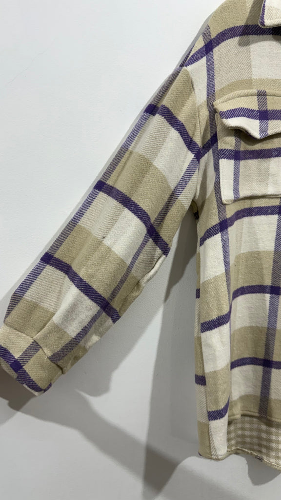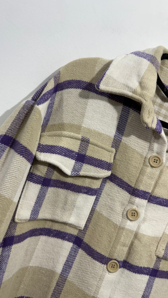 Sobrecamisa gruesa de corte recto a cuadros en tonos beige, camel y púrpura. . Es de franela, es súper calentita, tiene botones en parte delantera, cuello, camisero Y bolsillos Plastones en zona del pecho.