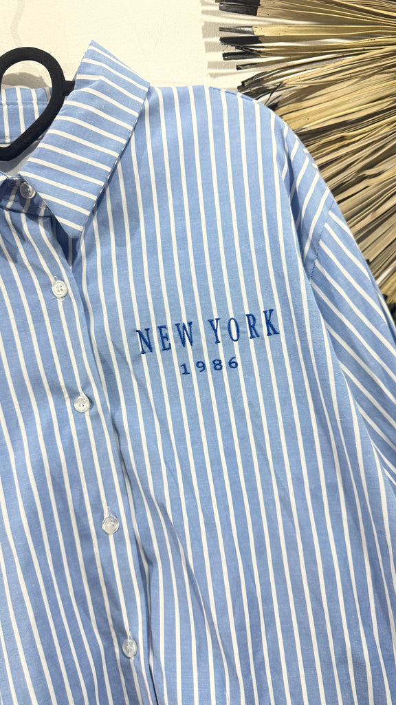 Chaqueta finita ablusada de popelin a rayas en azul y blanco. Tiene el bajo con goma fruncida, por dentro va forrada de tela y tiene cuello con solapas. Abotonado en parte delantera y bordados a un lateral en parte delantera y en espalda.