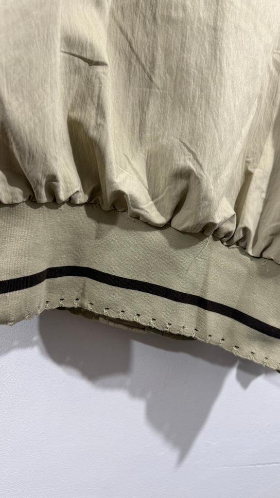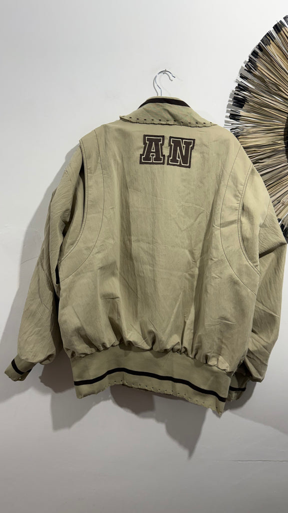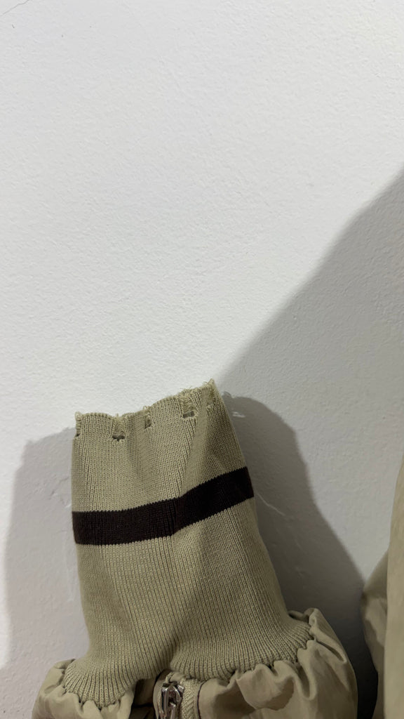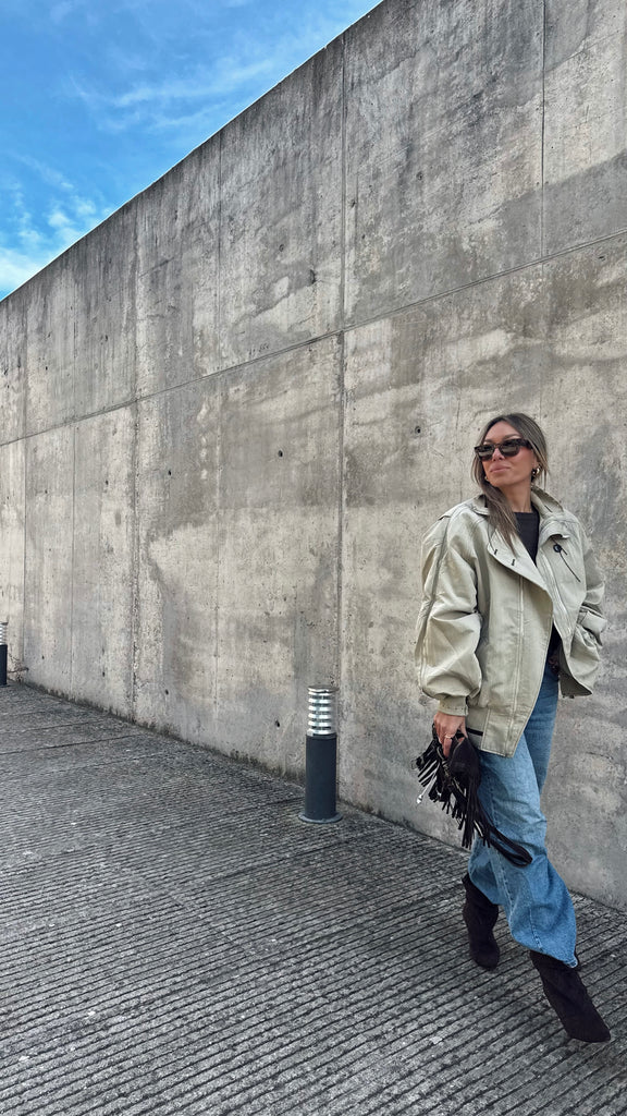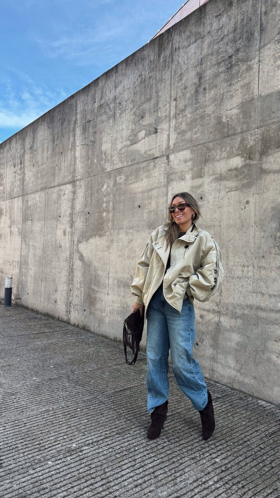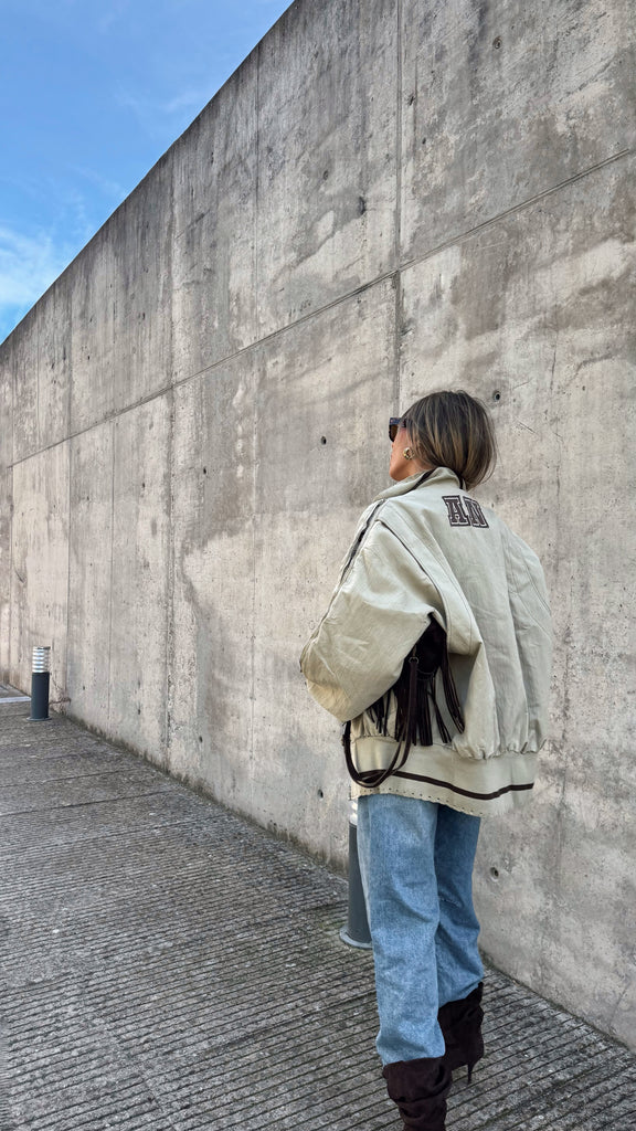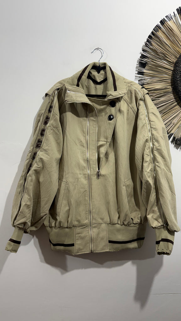 Chaqueta tipo Bomber en color crudo. Tiene máximo y manga con detalles de cremalleras en ambas mangas que se pueden abrir y cerrar. En parte de frontal delantera tiene doble cremallera y es multi posición. Tiene puños y bajo elástico con detalles de rotos. Por detrás tiene corte en las mangas, tipo chaleco y lleva detalle en espalda de letras.