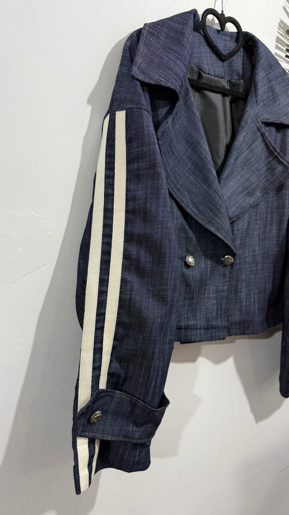 Chaqueta vaquera corte gabardina corta. Tono oscuro, por dentro va forrada de tela, cuello con solapas, botones en parte delantera y franjas en las mangas en color crudo.
