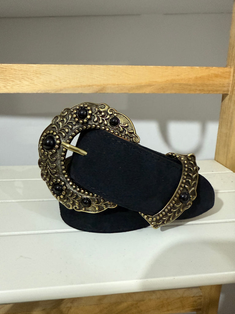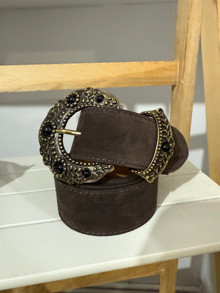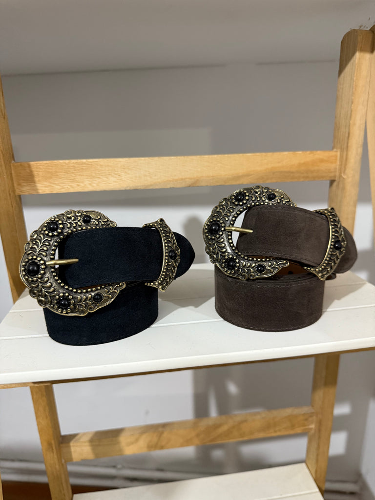 Cinturon de ante en chocolate y en negro. Maxi hebilla dorada con piedras de resina en el mismo color.