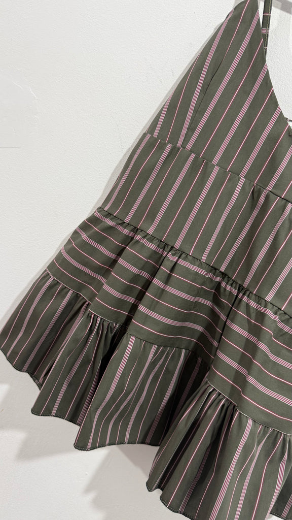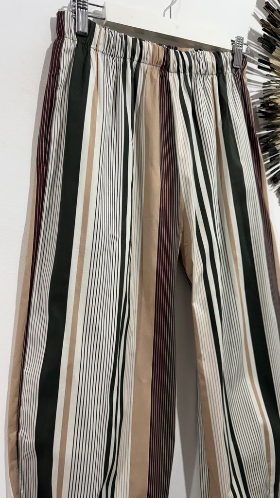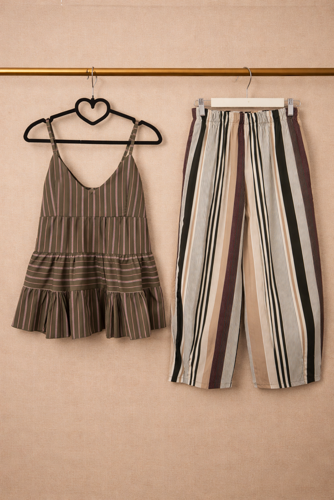 Conjunto dos piezas de popelin con estampado de rayas. Top de tirante con escote a pico, volantes y goma de nido de abeja n la espalda. Pantalón de corte Barrel con estampado a rayas multicolor con goma en la cintura y bolsillos laterales.
