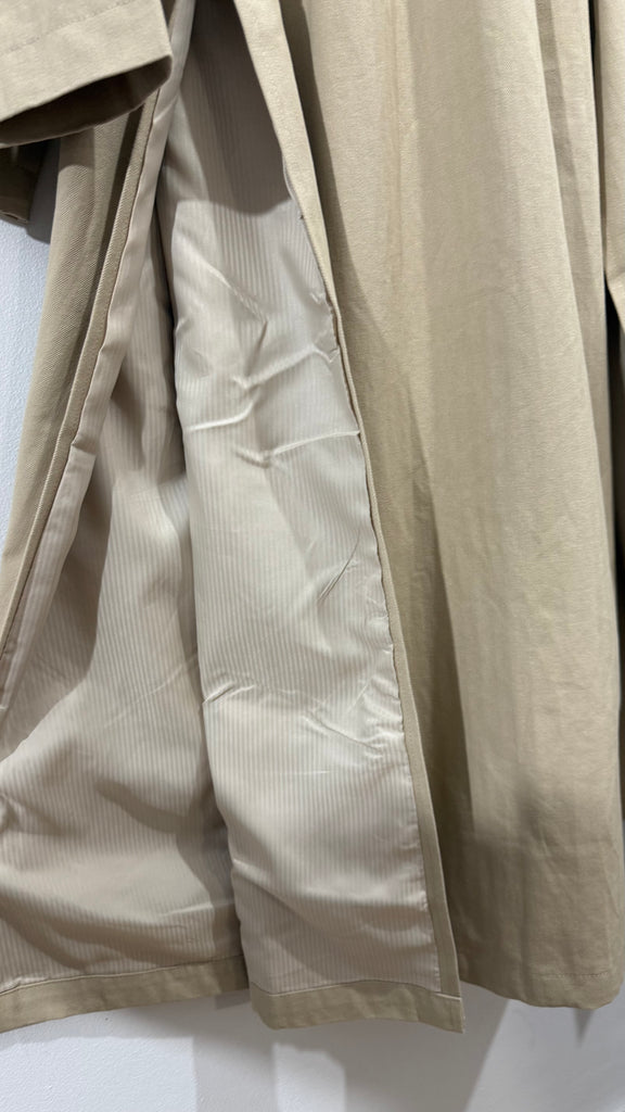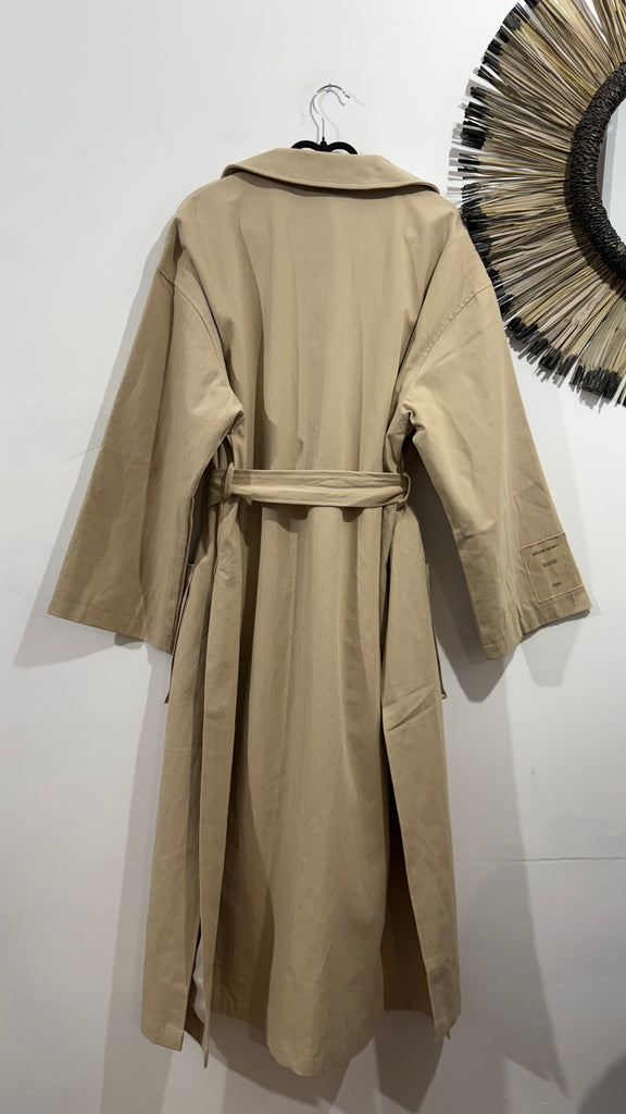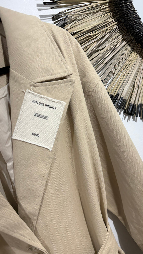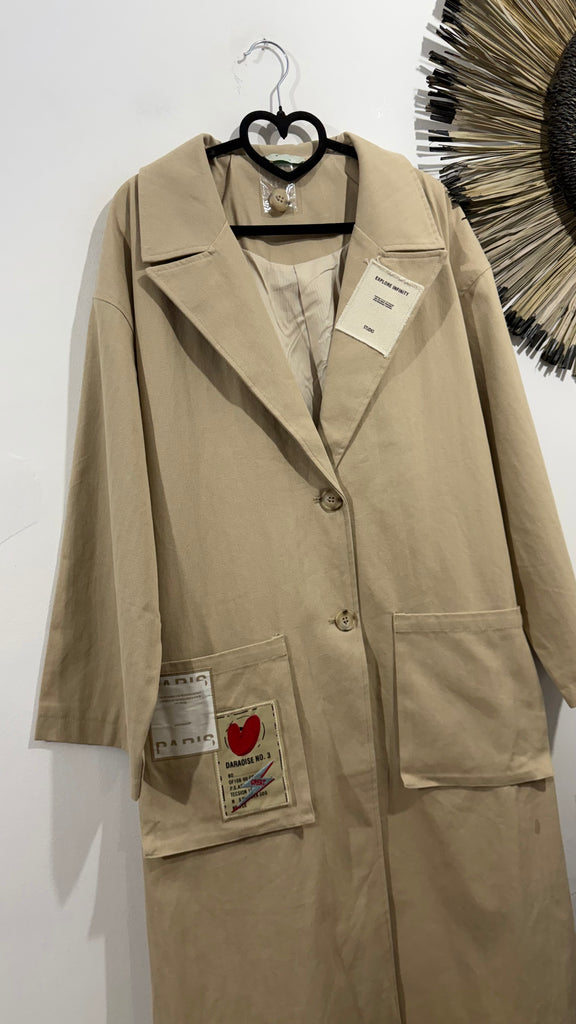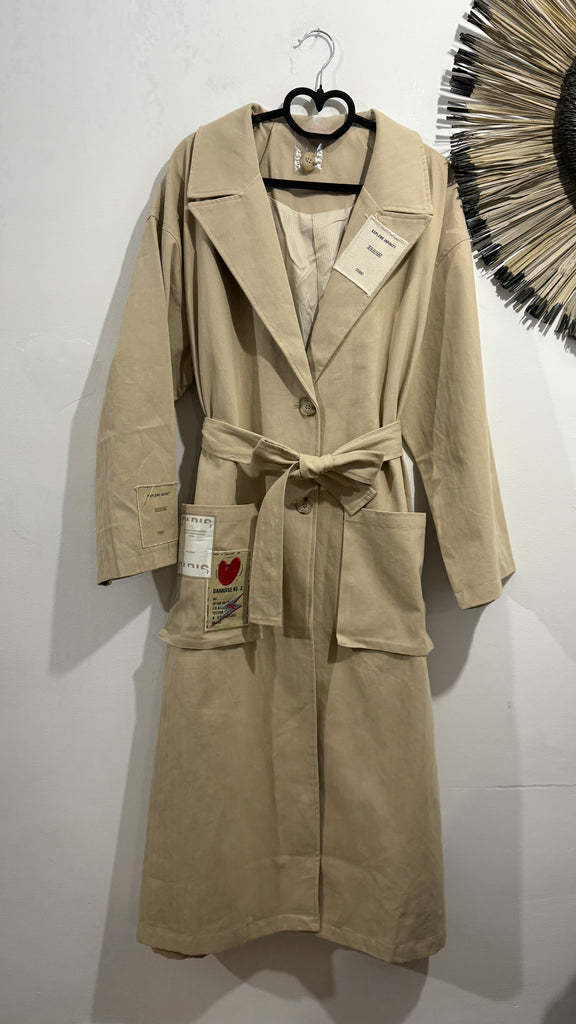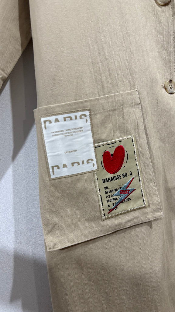 Gabardina de loneta en color beige. Tiene partches en solapa y bolsillo con bordados a mano. Tiene bolsillos en parte delantera y pode dentro va forrada de tela. Tiene cinturón y tiene aberturas a los laterales.