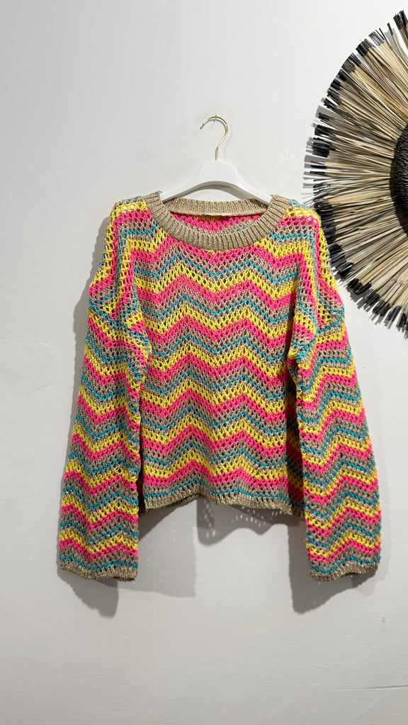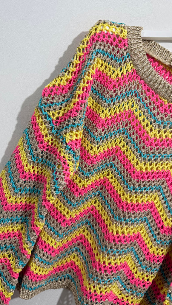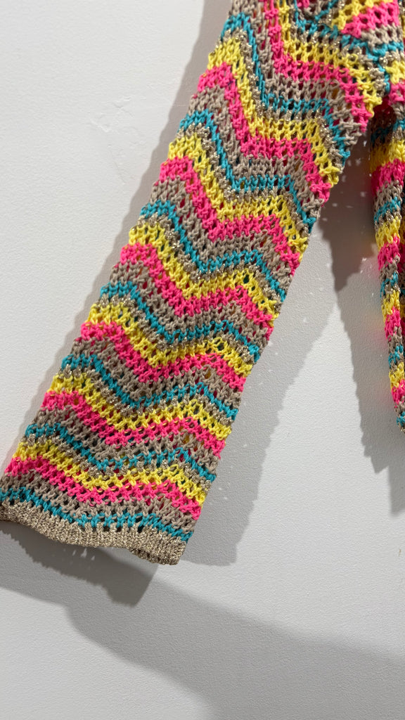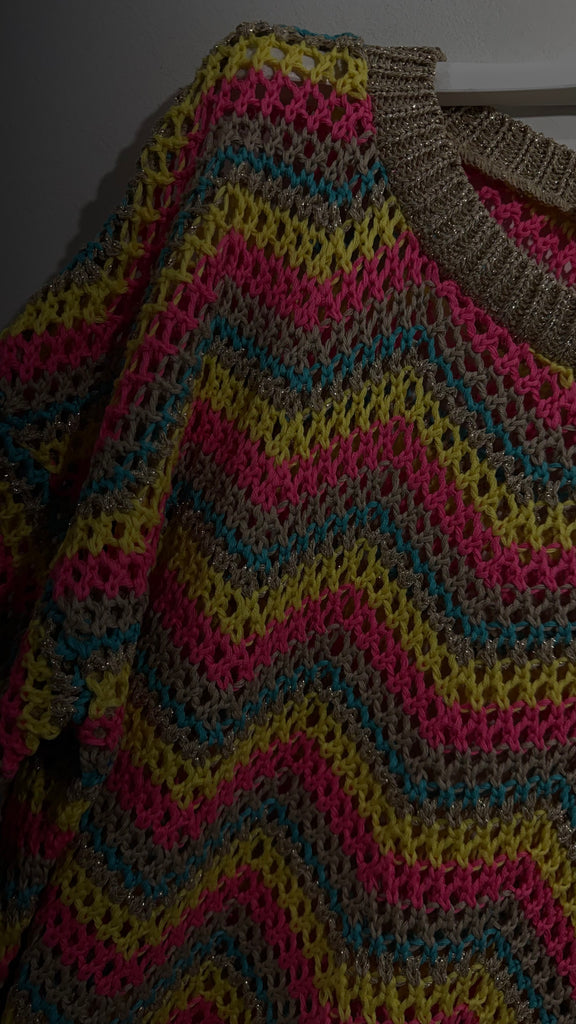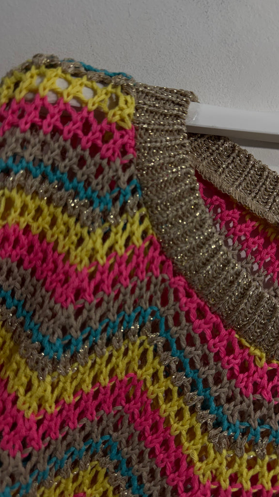 Jersey de ganchillo en tonos rosas, amarillos, azul y dorado. Tiene cuello redondo y manga acampanada.