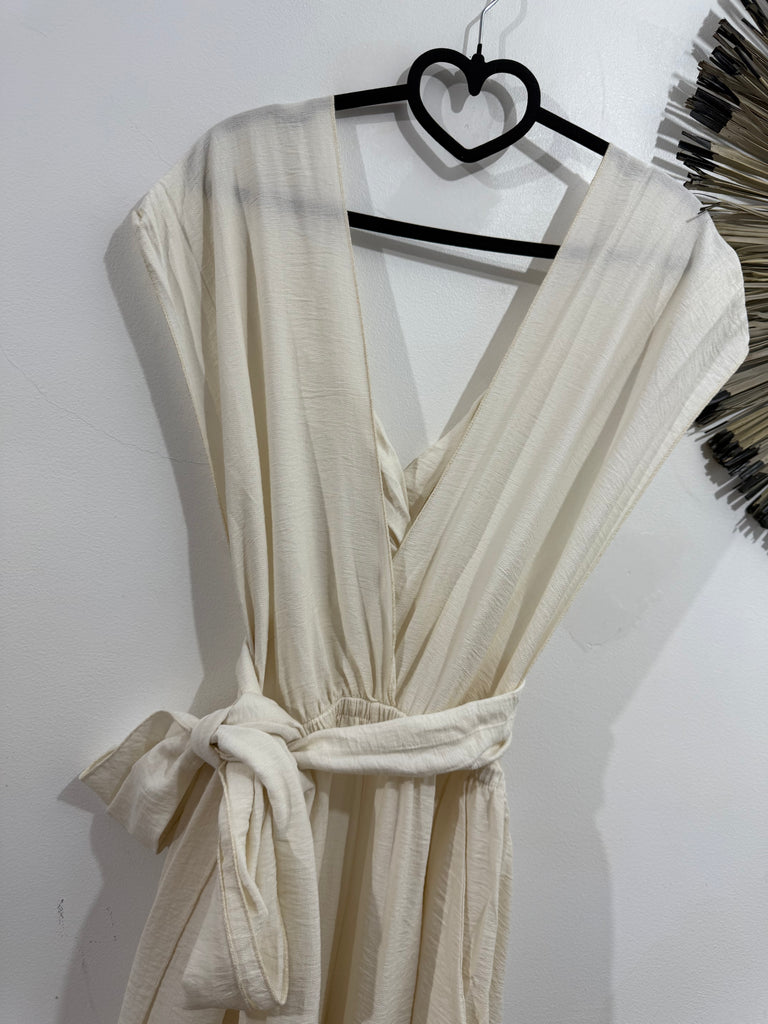 Mono multiposicion largo en color blanco. Escote a pico y anudado en el cuello. Tiene espalda al aire con goma en la cintura por la parte de atrás. Es de corte recto, palazzo y tiene bolsillos laterales. Sienta genial.
